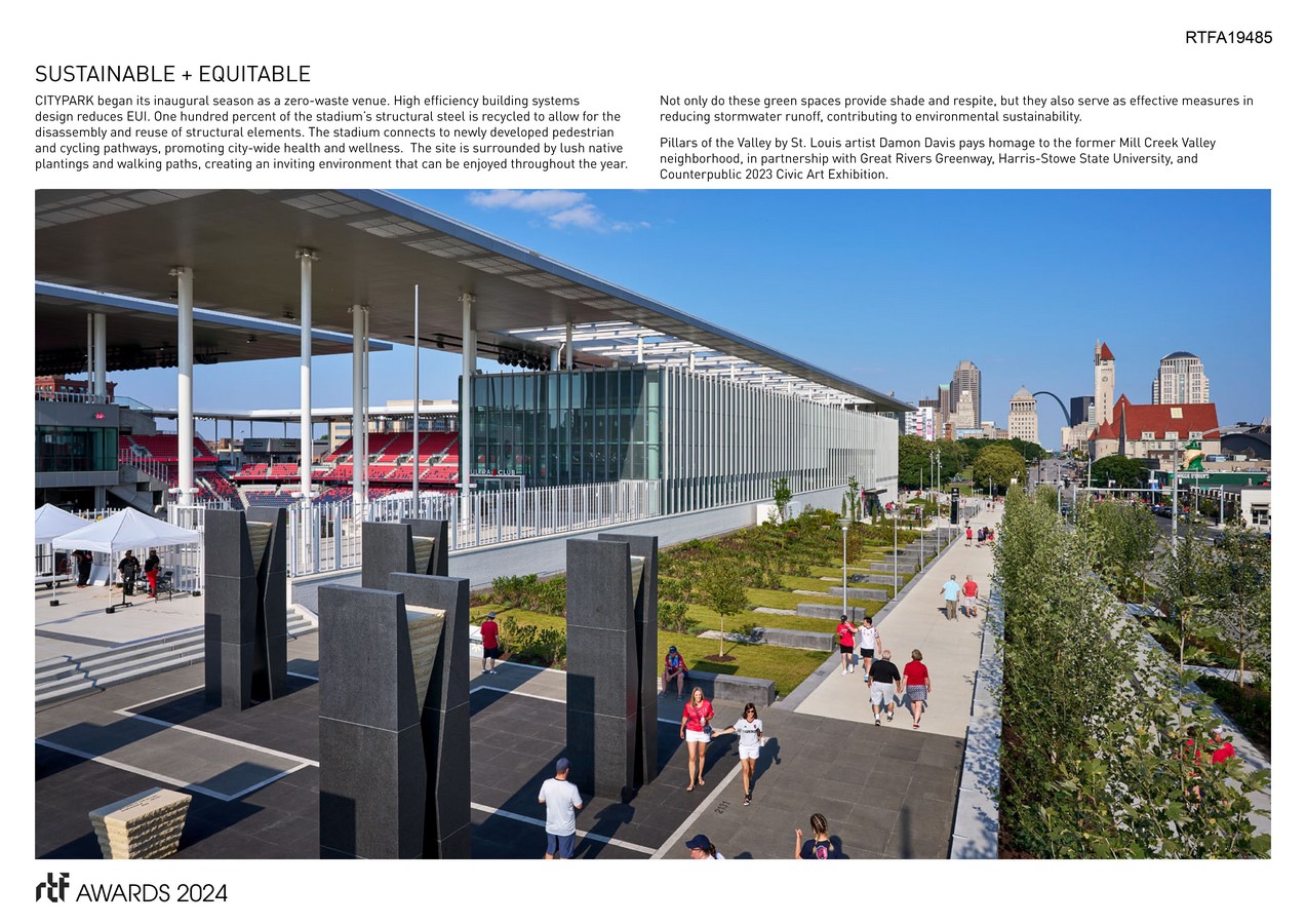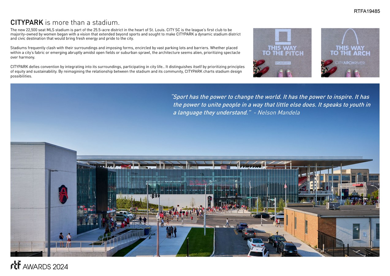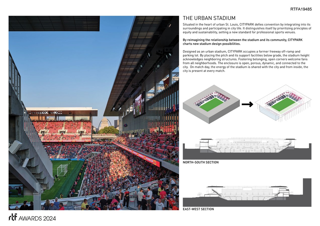 Situated in the heart of St. Louis, CITYPARK defies convention by integrating into its surroundings, participating in city life, forming a vibrant district attracting businesses and visitors all year long. It distinguishes itself by prioritizing principles of equity and sustainability, setting a new standard for professional sports venues. By reimagining the relationship between the stadium and its community, CITYPARK charts new stadium design possibilities.