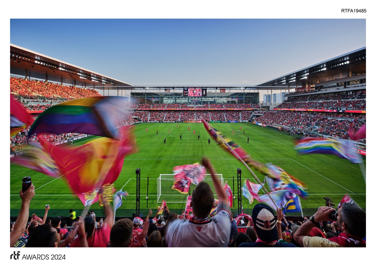 As an urban stadium, CITYPARK occupies a former freeway off-ramp and parking lot. By placing the pitch and its support facilities below grade, the stadium height acknowledges neighboring structures. Fostering belonging, open corners welcome fans from all neighborhoods. The enclosure is open, porous, dynamic, and connected to the city. On match day, the energy of the stadium is shared with the city and from inside, the city is present at every match.