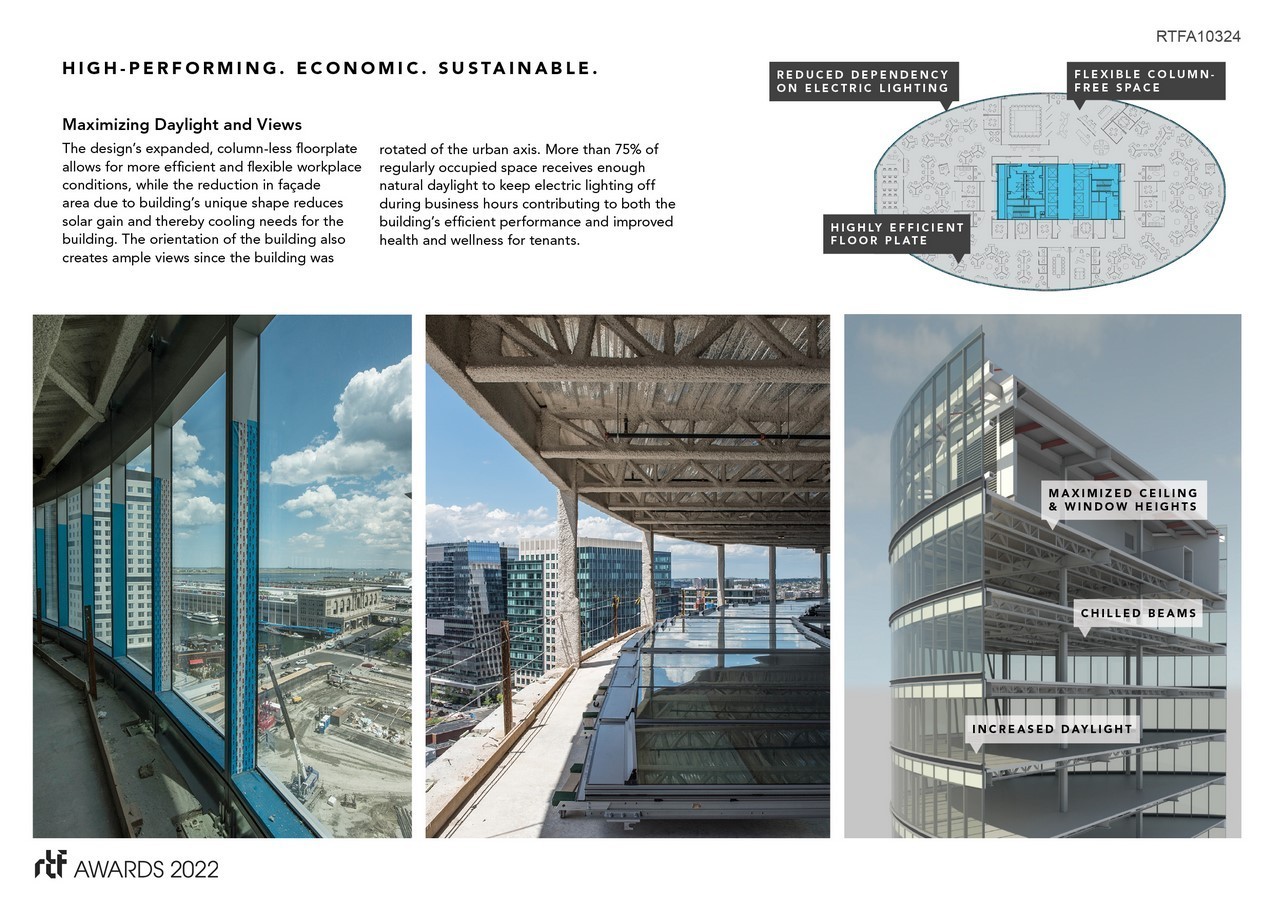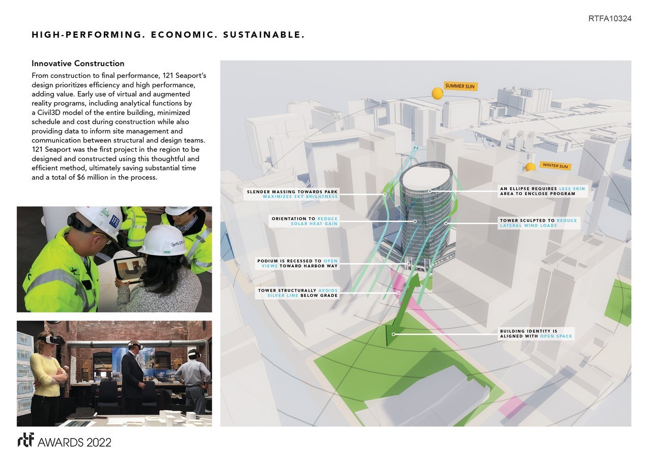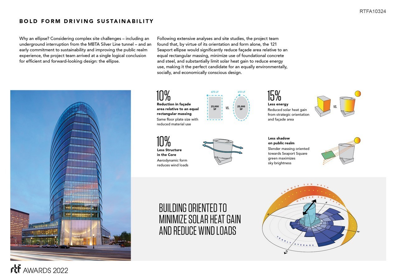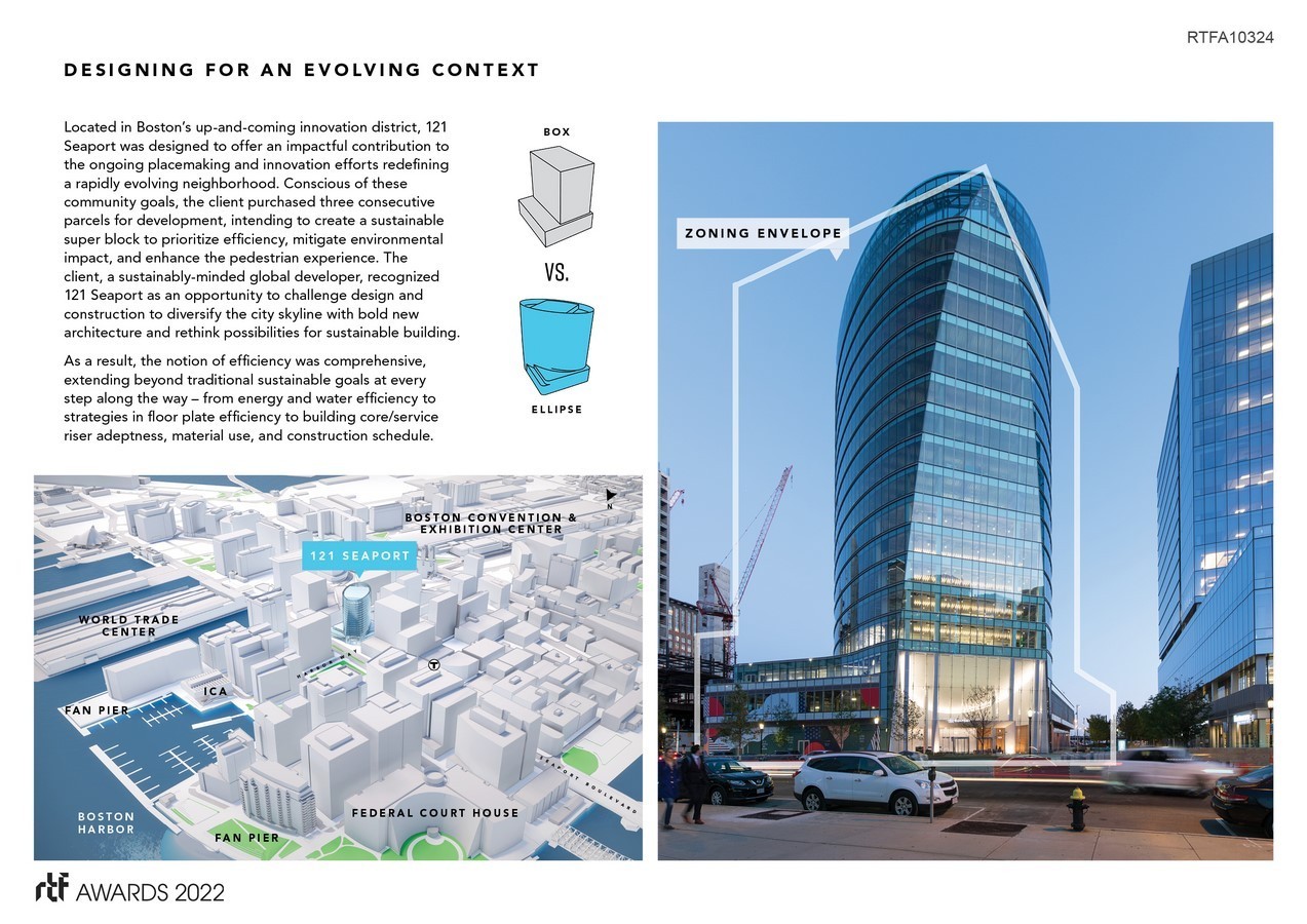 Once characterized by an expanse of parking lots and underdeveloped land, Boston’s Seaport District has been redefined by glass-box buildings as it continues its transformation into the city’s designated innovation district. While the site’s convenient proximity to Logan Airport offers great connectivity, one unintended consequence of this location is that building heights must be kept relatively low due to overhead flight paths. This requirement eventually resulted in a sea of truncated, stout building volumes, which many have criticized. In an effort to challenge this typology, the elliptical and highly-sustainable form of 121 Seaport emerges as a fresh and unique design that offers a truly innovative solution for the innovation district.