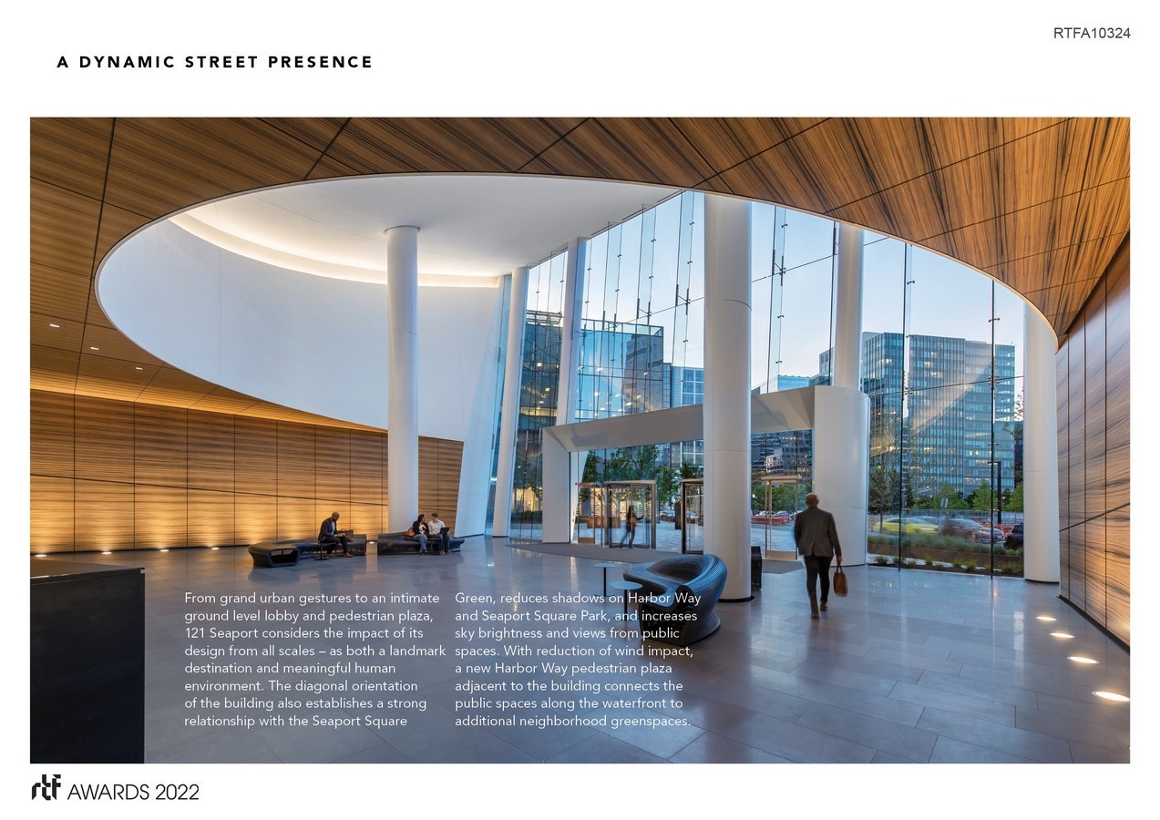 A LEED Platinum-certified building, 121 Seaport thoughtfully responds to its context – both present and future – to introduce a bold new building that diversifies both skyline and streetscape. From grand urban gestures to an intimate ground level lobby and pedestrian plaza, 121 Seaport considers the impact of its design from all scales – as both a landmark destination and meaningful human environment.