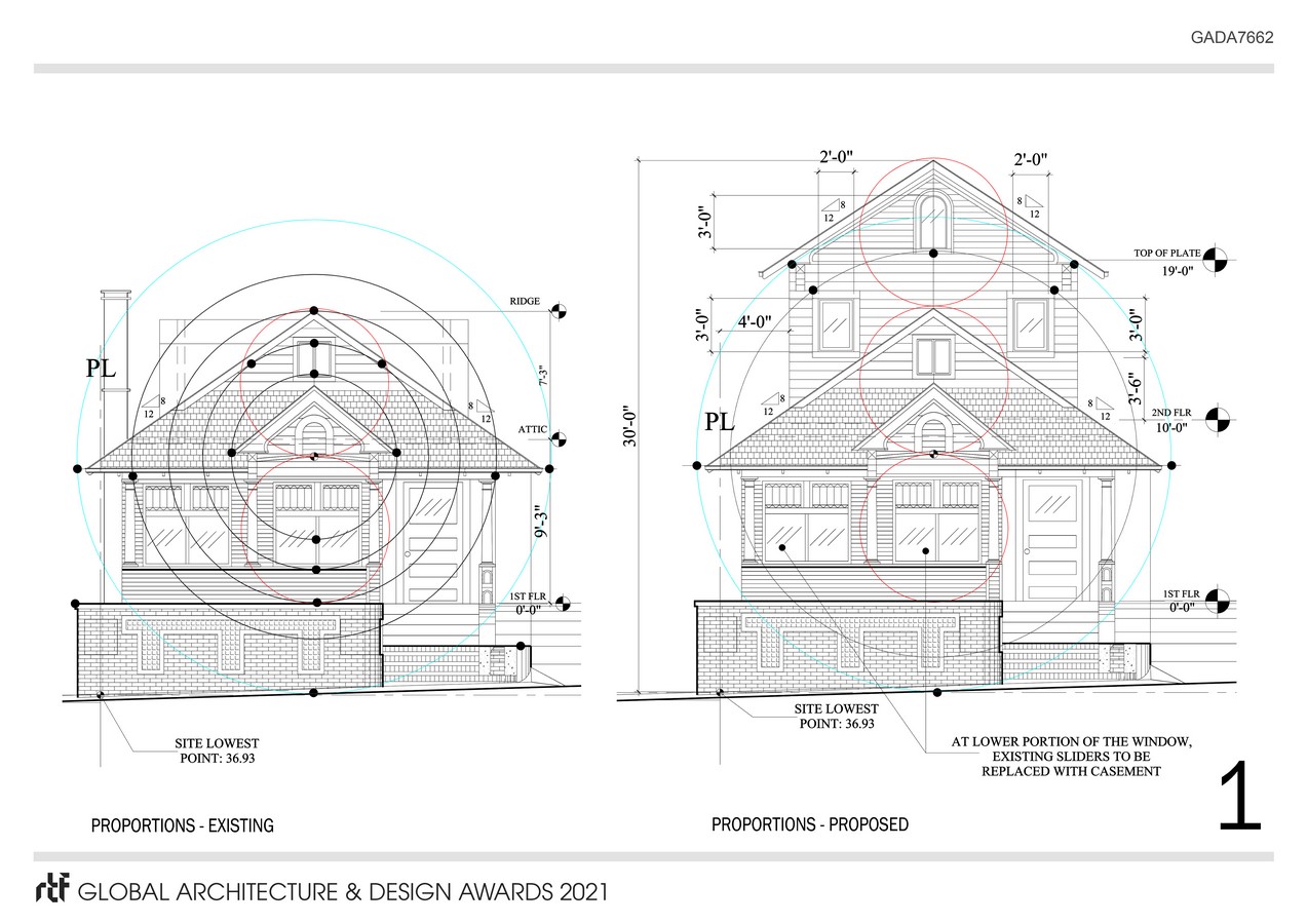 Since no drawings of the project existed in the archive, the project was field measured extensively so the floor plans and elevations could be reconstructed. During the field measurement and study of the dimensions, both vertical and horizontal, a very sophisticated system of proportions was discovered. Following the existing proportions as well as the original design intent, the building’s architectural components (sheets 1 through 3), the new addition was developed. Project went through several renditions to satisfy the client needs as well as that of the City’s Design Advisory Board. Use of correct proportions as well as architectural vocabulary of the existing building allowed the project to come close to what the original architect would have done to add a second floor.