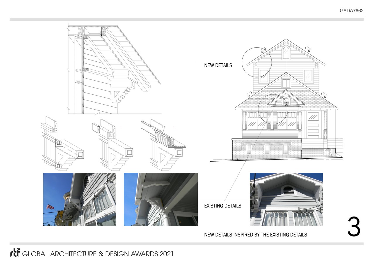 The building structure had deteriorated throughout the years due to settlement caused by minimal concrete foundations as well as massive termite damage. The attic space was utilized during the years as an apartment which did not have proper amenities thus taxing the building further into deterioration. Building style can be considered a hybrid of Victorian, Georgian and Orientalist movement of the 19th century. These details were carefully studied to inspire the details developed for the addition and the repairs as shown on sheets 1 through 6.