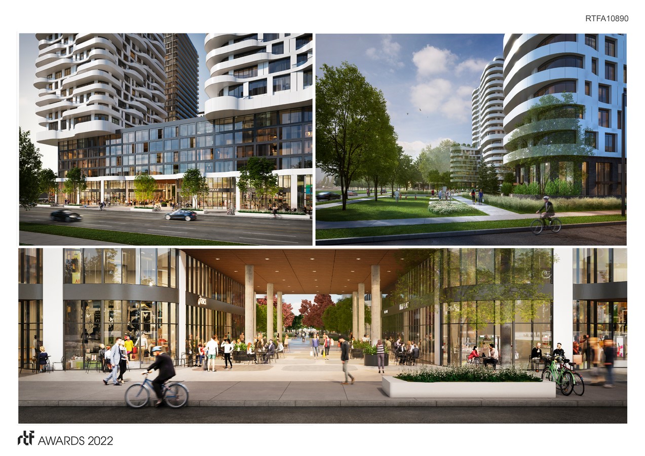 Above the retail base, the condominium towers are 35 and 45 storeys. The back towers furthest from the main street are 16 storeys with grade-related townhouses providing a transition to the adjacent residential neighbourhood.