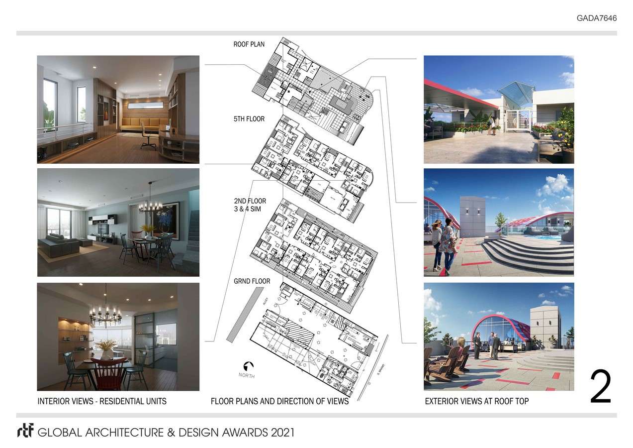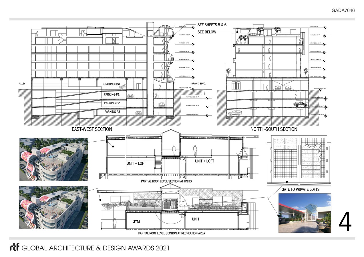 Project consists of 38 units of apartment/condominium with mix of one, two, and three bedrooms. Some units on the 5th floor are two level with a work/loft/studio space at the roof level which can be accessed independently through the recreational roof garden making these fifth floor units complete “work/live” units. As a plus to having three levels of subterranean parking, the project is located within walking distance of Gold Line Metro Rail station. The single bedroom units are at minimum of 900 square feet, two bedrooms at minimum of 1,200 square feet and three bedrooms at 1,500 square feet. The three bedroom units are equal to size of many single family homes in the area. The roof garden provides outdoor entertainment areas with spa/Jacuzzi, outdoor dining, including movie nights for the residents. In addition the project provides a two level common space for events as well as indoor and outdoor gymnasium space. There is a retail space at the ground level as well as leasing facilities.