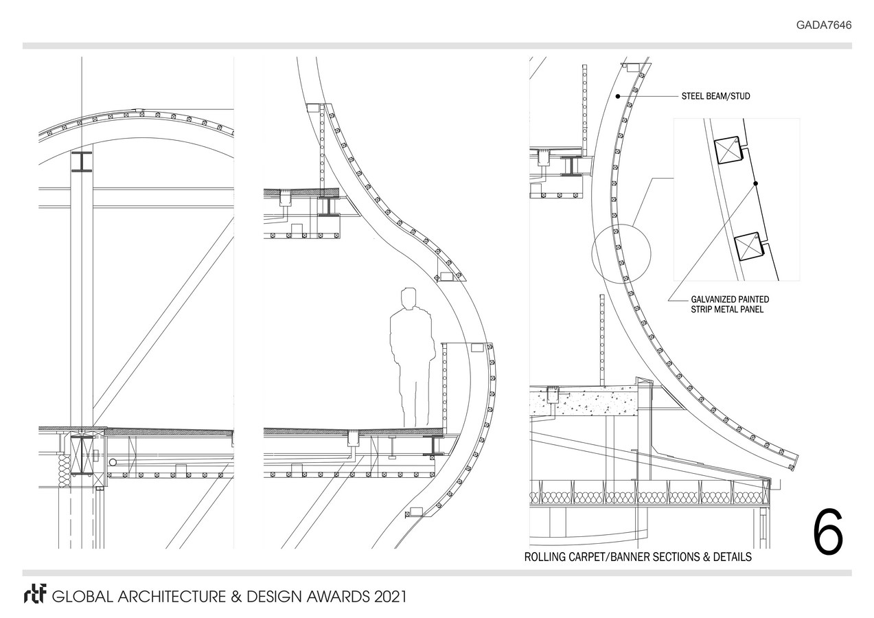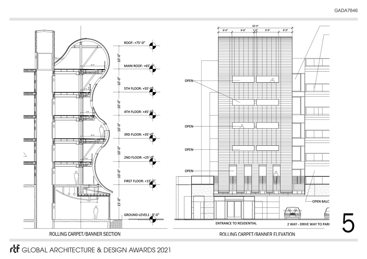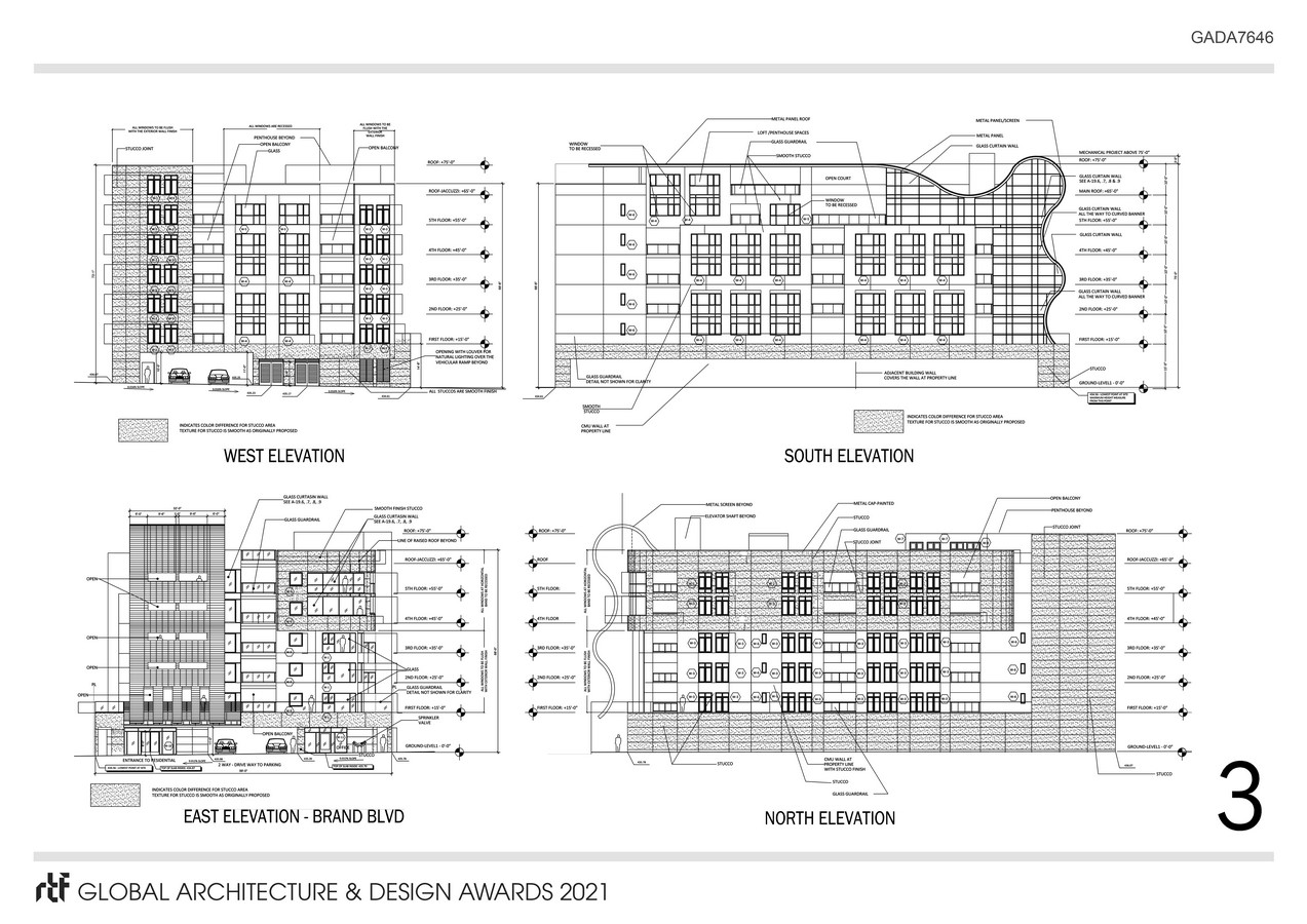 The project façade is designed to become a “Welcoming Red Carpet” when travelling north on Brand Blvd entering Glendale. While the north facade becomes a horizontal banner saluting those leaving the city travelling south toward Los Angeles. The “Red Carpet” is constructed (as shown on pages 5 and 6) with metal panels six inches wide and backed with steel curved beams. The narrow metal panels are easy to install and easy to replace if necessary. The areas behind the “Red Carpet” are outdoor balconies at the elevator lobbies of each floor offering views while waiting. Even though the glass curtain wall gets attached to the “Red Carpet” on both sides, the space behind it remains on the outside area which will not require complicated water proofing. This is shown on the partial sections at sheet 3 and 4.