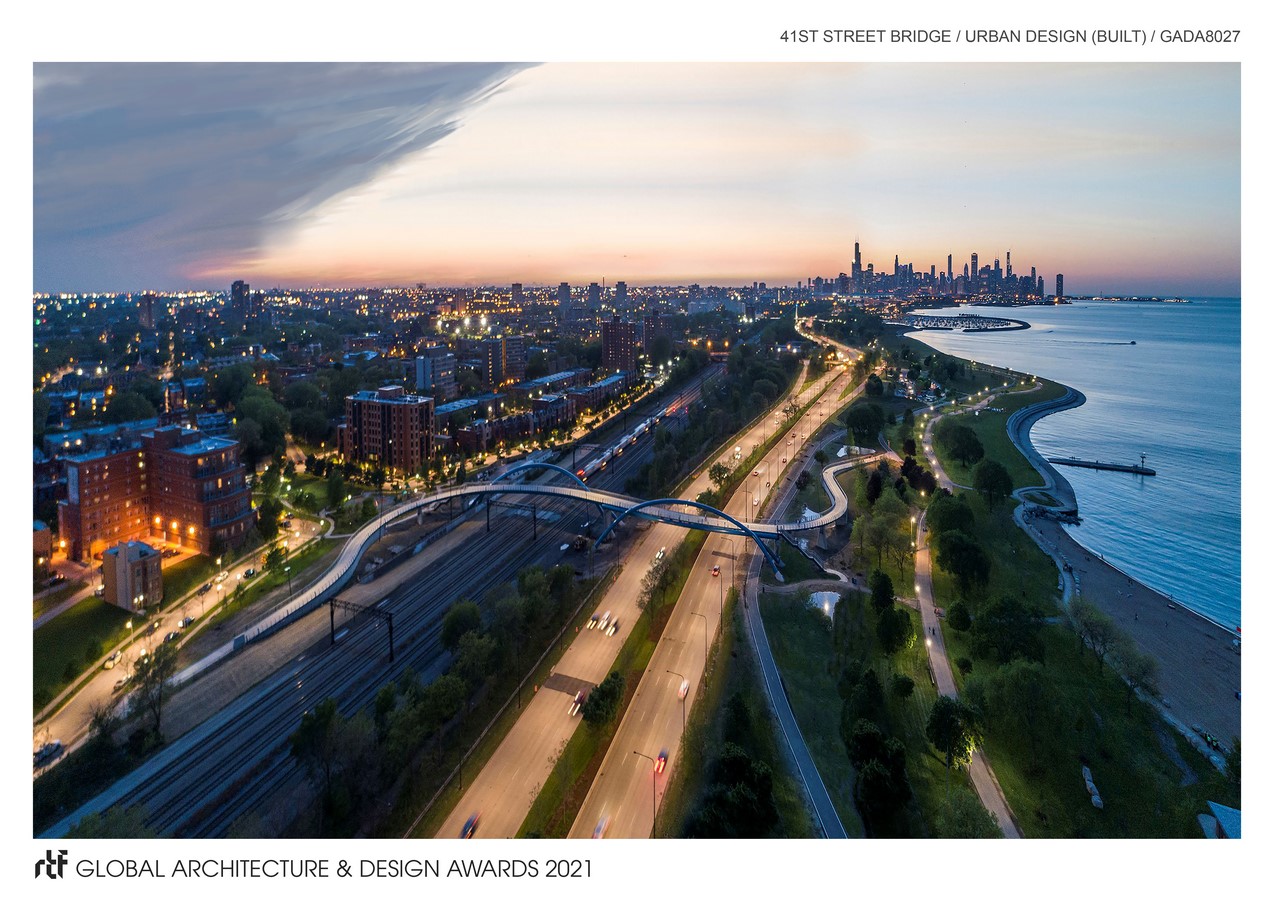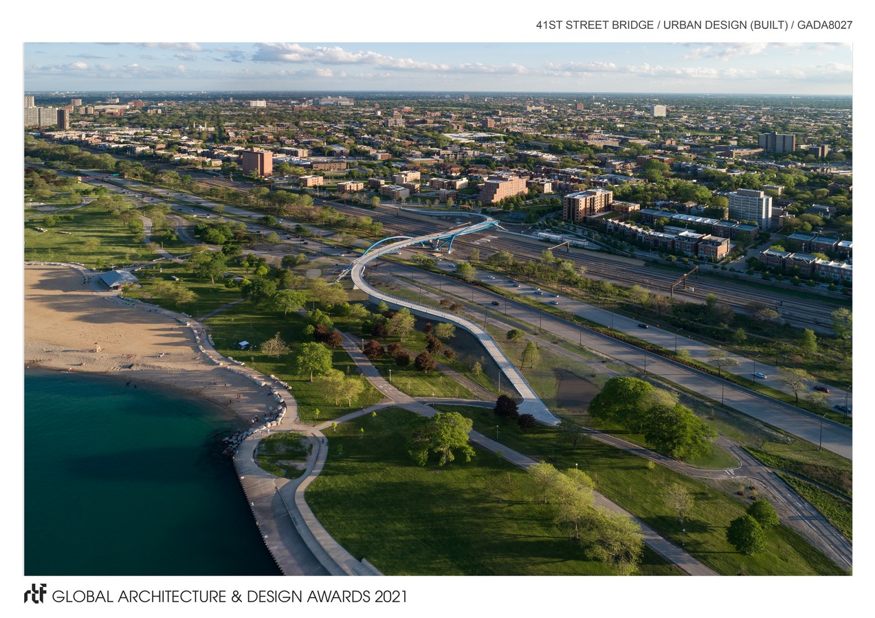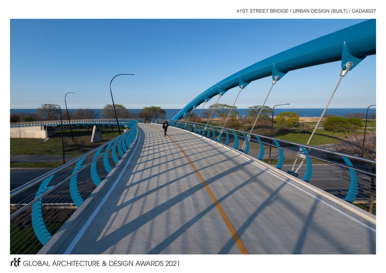 The 41st Street Bridge, the result of an international competition called “Bridging the Drive,” is a major civic project that provides bicycle and ADA-compliant pedestrian, wheelchair, and stroller lakefront access for a long-underserved area of Chicago.