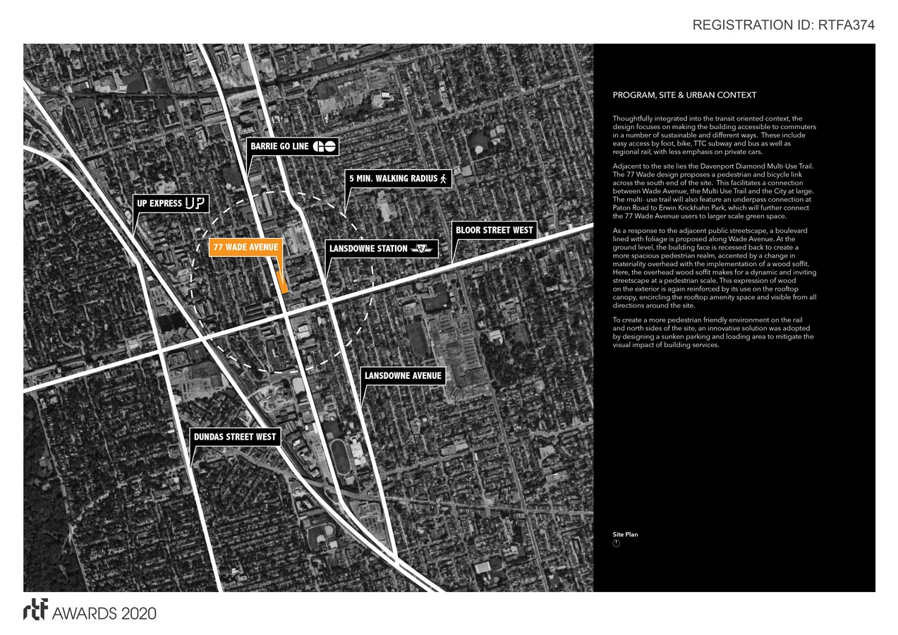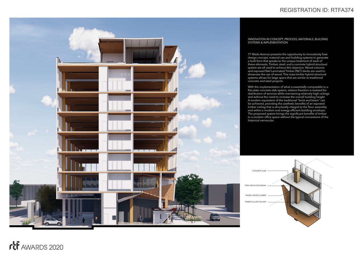 Today, tech-oriented and innovative companies desire work environments that hum with architectural character. 77 Wade, an 18-hour building, achieves this with the use of wood construction and the fusion of contrasting materials. The provision of communal spaces for both the building’s users and the public, paralleled with the use of appropriate landscape design and softer and transparent cladding materials, makes 77 Wade Avenue a state-of-the-art contemporary office building that addresses the City of Toronto and its’ urban citizens with a unique and innovative architectural language.