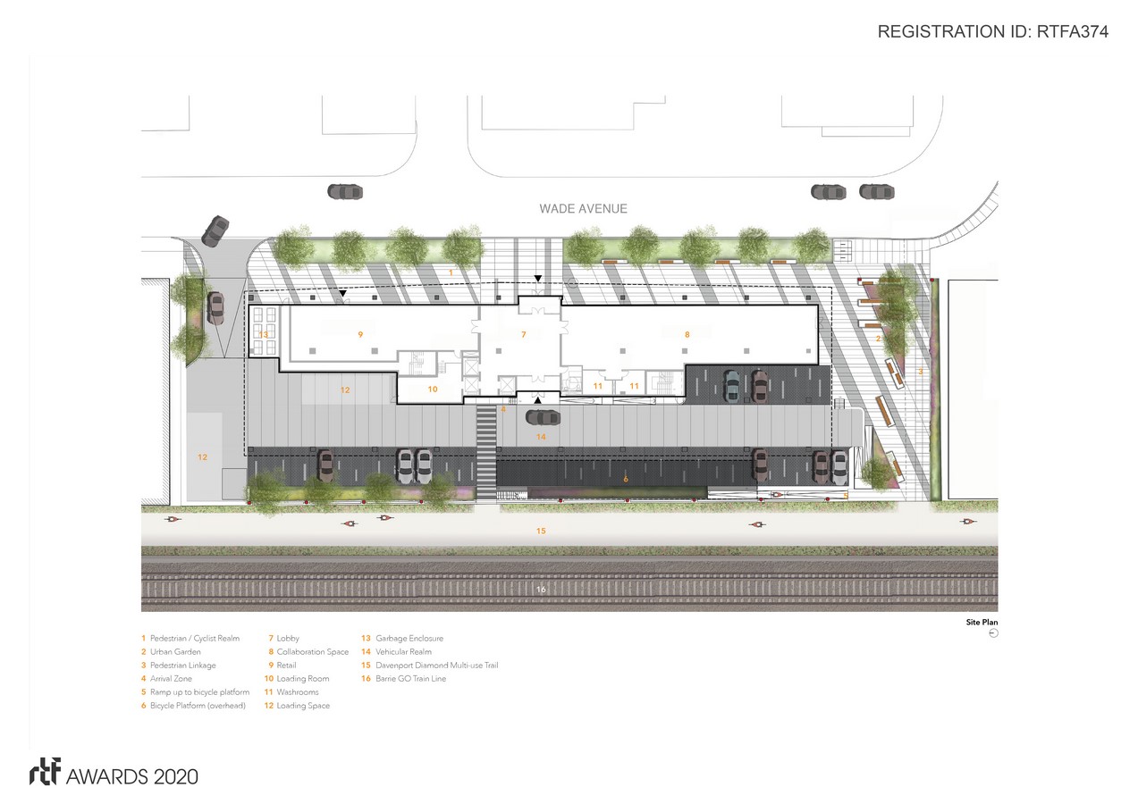 Thoughtfully integrated into the transit-oriented context, the design focuses on making the building accessible to commuters in a number of sustainable and different ways. These include easy access by foot, bike, subway, bus, and regional rail, with less emphasis on cars. Adjacent to the site lies a multi-use trail. 77 Wade’s design proposes a pedestrian and bicycle link across the south end of the site, facilitating a connection between Wade Avenue, the multi-use trail and the city at large. Tucked partially below the building, a sunken parking and loading area is placed at grade to mitigate the visual impact.