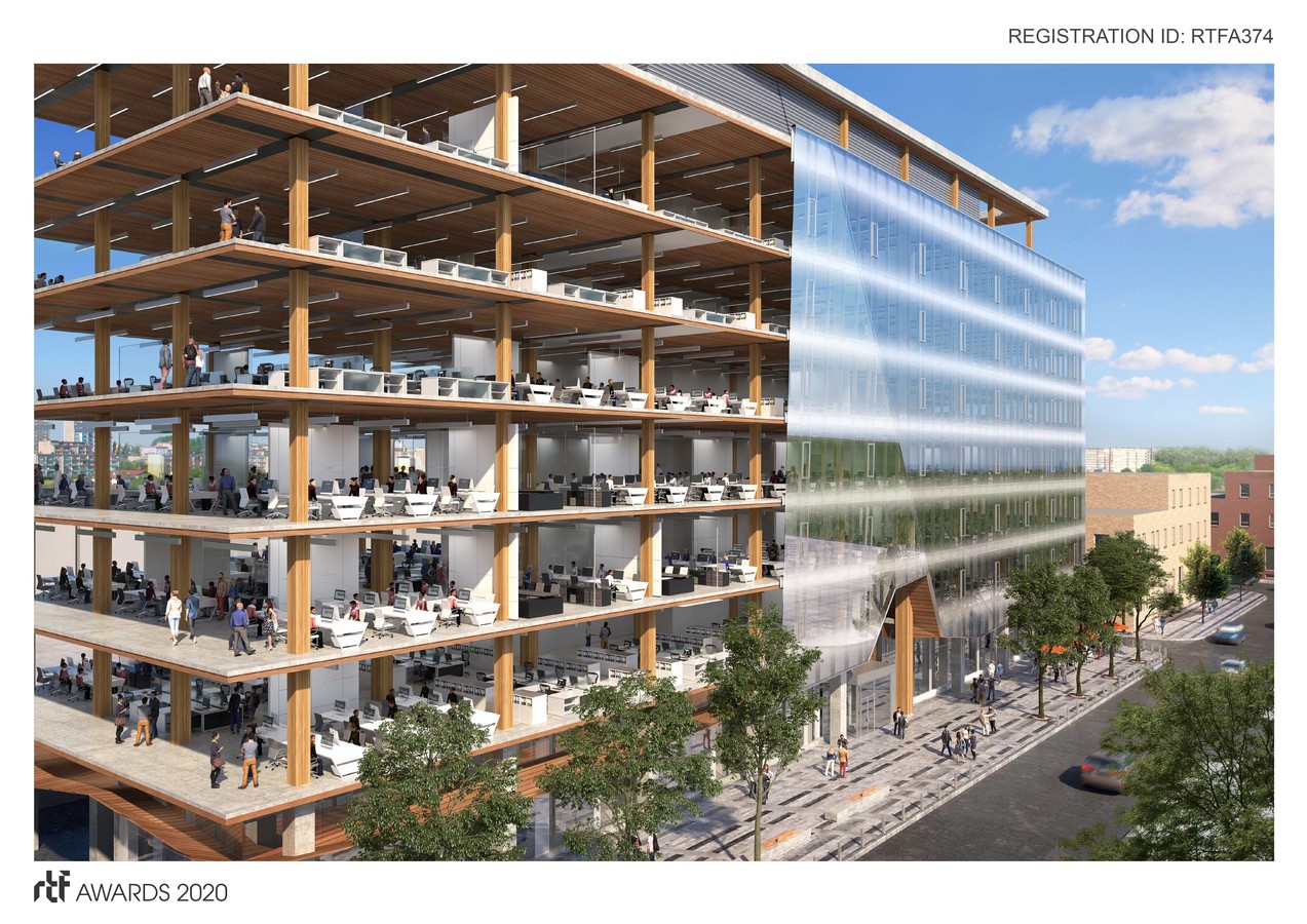 The overall design celebrates the advanced use of mass-timber construction within the ever-evolving architectural landscape. The development and design of 77 Wade maximize and streamlines the inherent structural and aesthetic qualities of exposed wood construction in a new and modern way; ultimately showcasing both our Canadian talent pool and our renewable wood resource. The building’s envelope will be predominately clad in a folded plain of curtain wall to expose the innovative structure within, while also adding a dynamic form to the streetscape. The approach to the building is unified with an origami-based geometric soffit and organic front entrance, retail and flexible collaboration spaces.