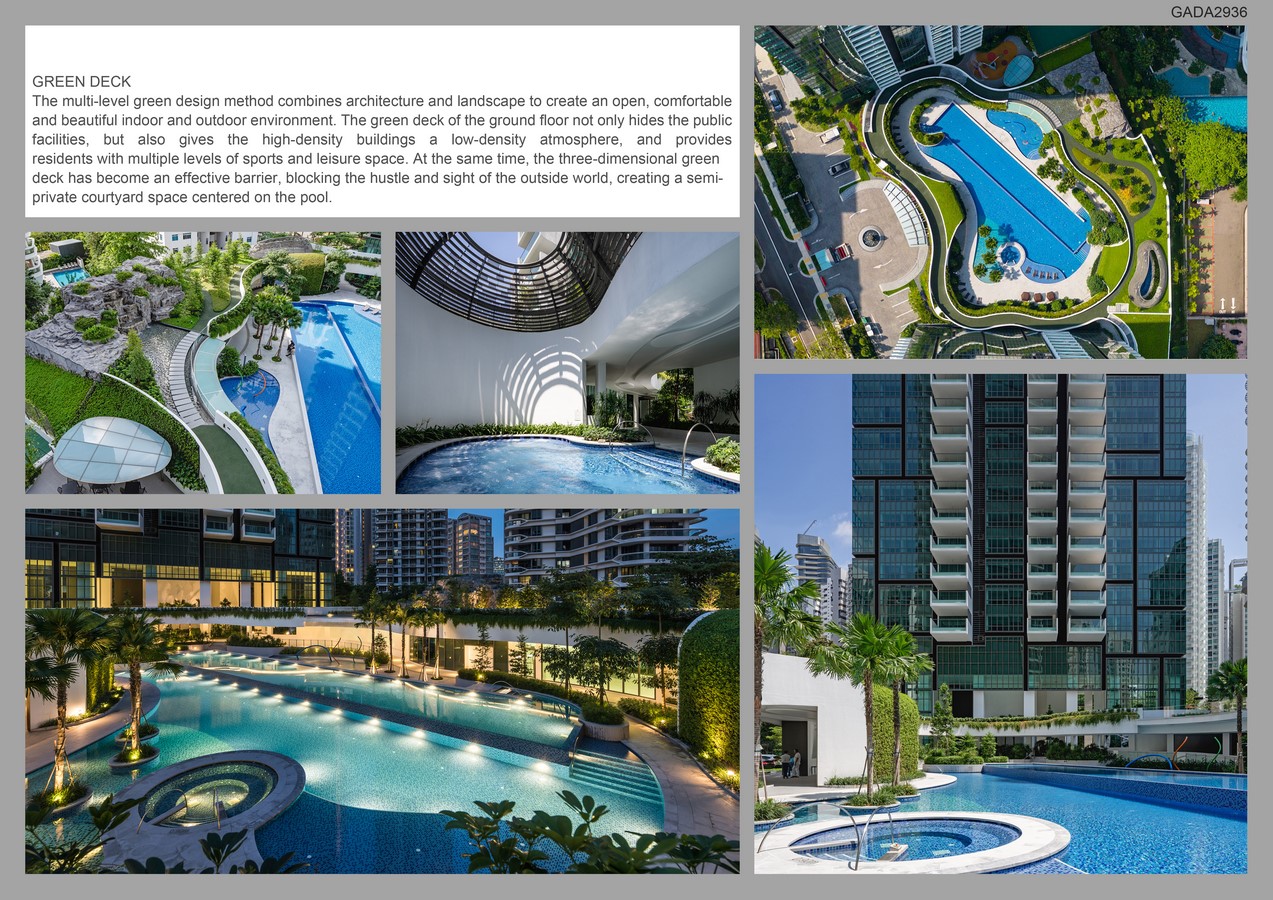 Within it, lies lush greenery with a beautiful lounge area for the residents’ enjoyment. The green deck on the ground floor uses a multi-layer green technique that increases the density of nature which benefits the overall environment. Furthermore, the green deck also acts as a barrier to the public, resulting in a semi-public space for the pool area. The effect of this at the green deck blurs the scale of the facility building and merges it to the ground while hiding the facilities beneath the green deck.