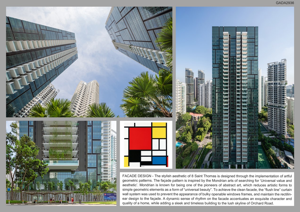 8 Saint Thomas seeks to create a living environment that is luxurious, modern, stylish and sustainable. The condominium attempts to redefine the ideals of modern urban living through the implementation of artful geometric Mondrian pattern on the façade. A dynamic sense of rhythm on the façade accentuates an exquisite character and quality of a home while adding a sleek and elegant building to the lush skyline of Orchard Road.