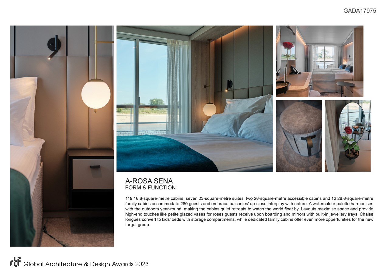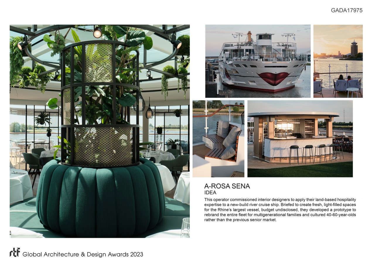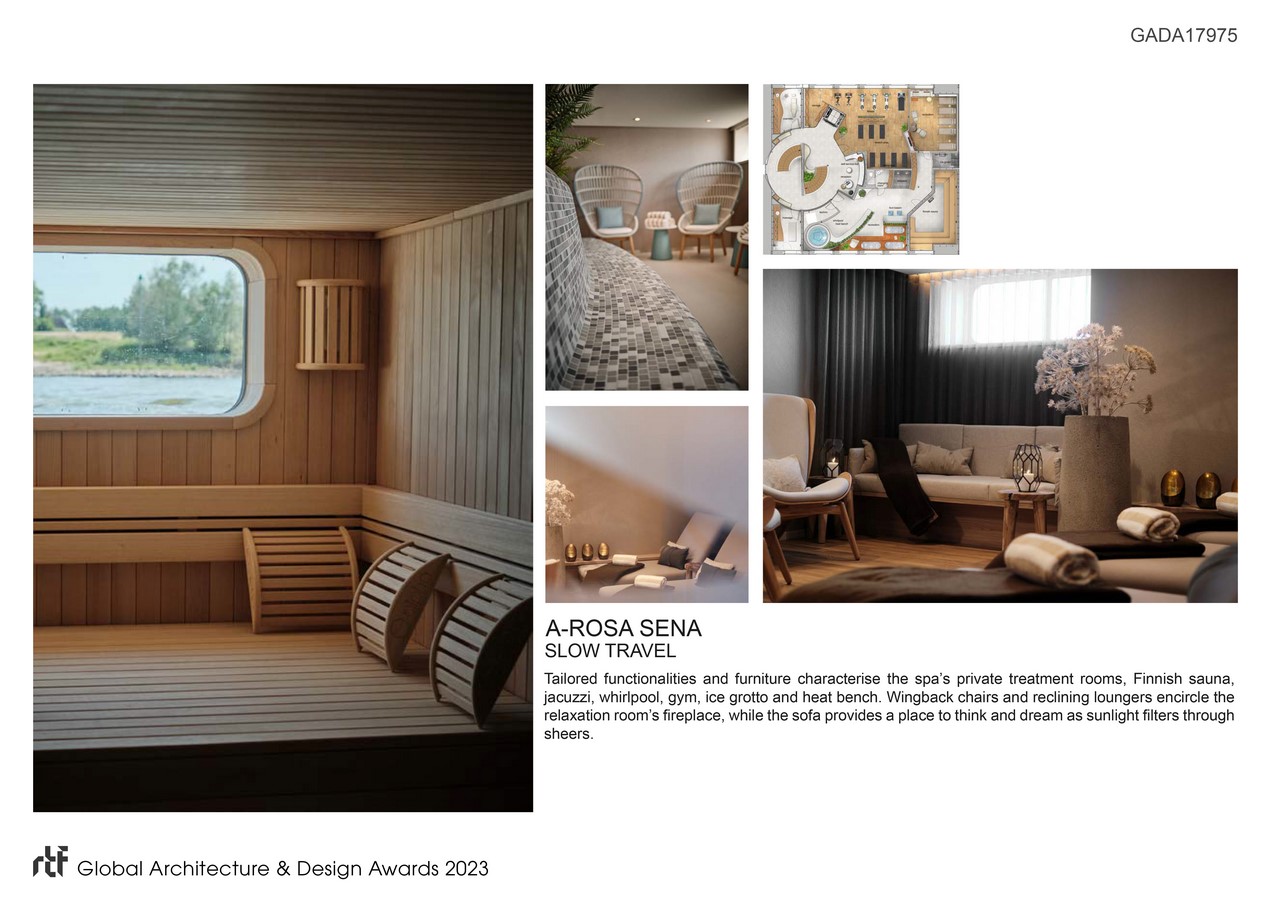 Completed June 2022, the ship revolutionises river cruising, preserving the beauty of slow travel as an antidote to the itineraries’ energetic “city hopping.” Natural finishes make the vista centre stage, while weighted, stabilised and weatherproofed contemporary furniture suggests residential-style private yachts. Bestowed the German Award for Sustainability Projects 2022 by DISQ, the German Institute for Service Quality, the ship features an exhaust gas purification filter and an innovative hybrid propulsion E-motion system that switches to battery power when entering and leaving ports for virtually silent, emission-free calls. Sustainability guided specified materials and spatial layouts, including numerous water bottle refill stations to reduce plastic consumption.