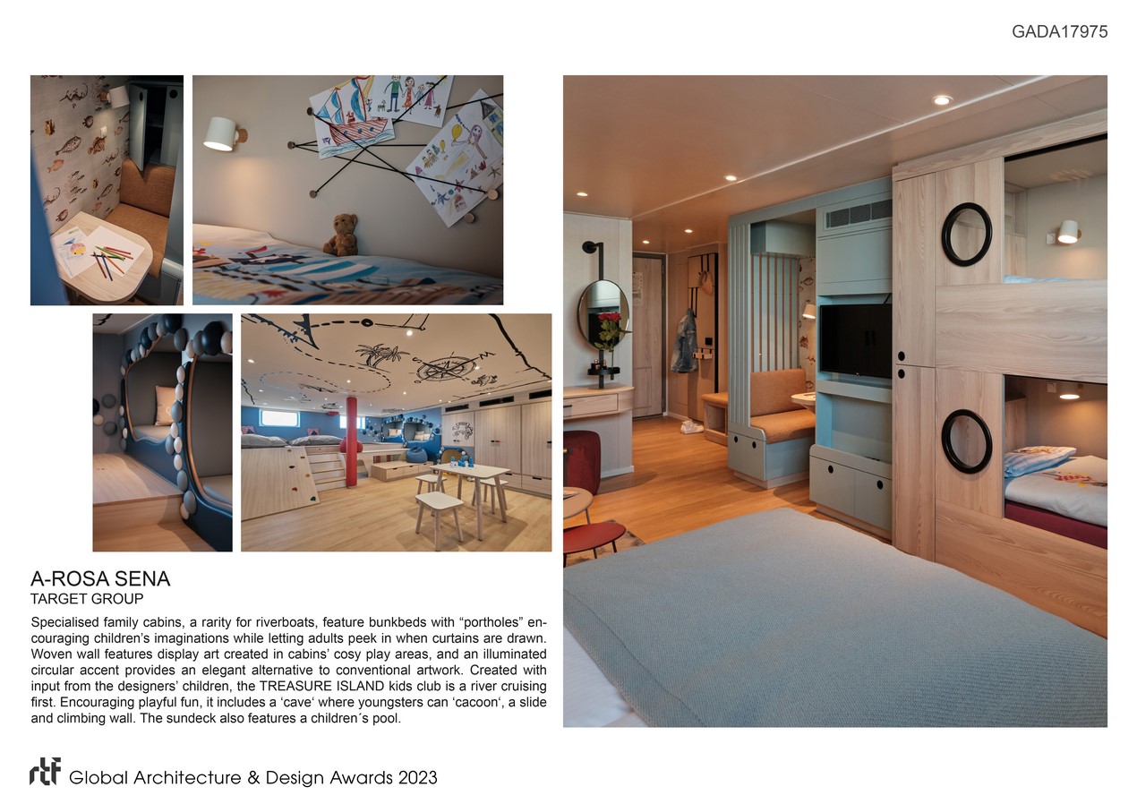 119 16.6-square-metre cabins, seven 23-square-metre suites, two 26-square-metre accessible cabins and 12 28.6-square-metre family cabins accommodate 280 guests and embrace balconies’ up-close interplay with nature. A watercolour palette harmonises with the outdoors year-round, making the cabins quiet retreats to watch the world float by. Layouts maximise space and provide high-end touches like petite glazed vases for roses guests receive upon boarding and mirrors with built-in jewellery trays. Chaise longues convert to kids’ beds with storage compartments, while specialised family cabins, a rarity for riverboats, feature bunkbeds with “portholes” encouraging children’s imaginations while letting adults peek in when curtains are drawn. Woven wall features display art created in cabins’ cosy play areas, and an illuminated circular accent provides an elegant alternative to conventional artwork. Created with input from the designers’ children, the ship’s huge play zone keeps kids entertained.