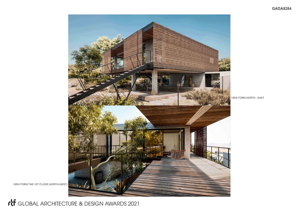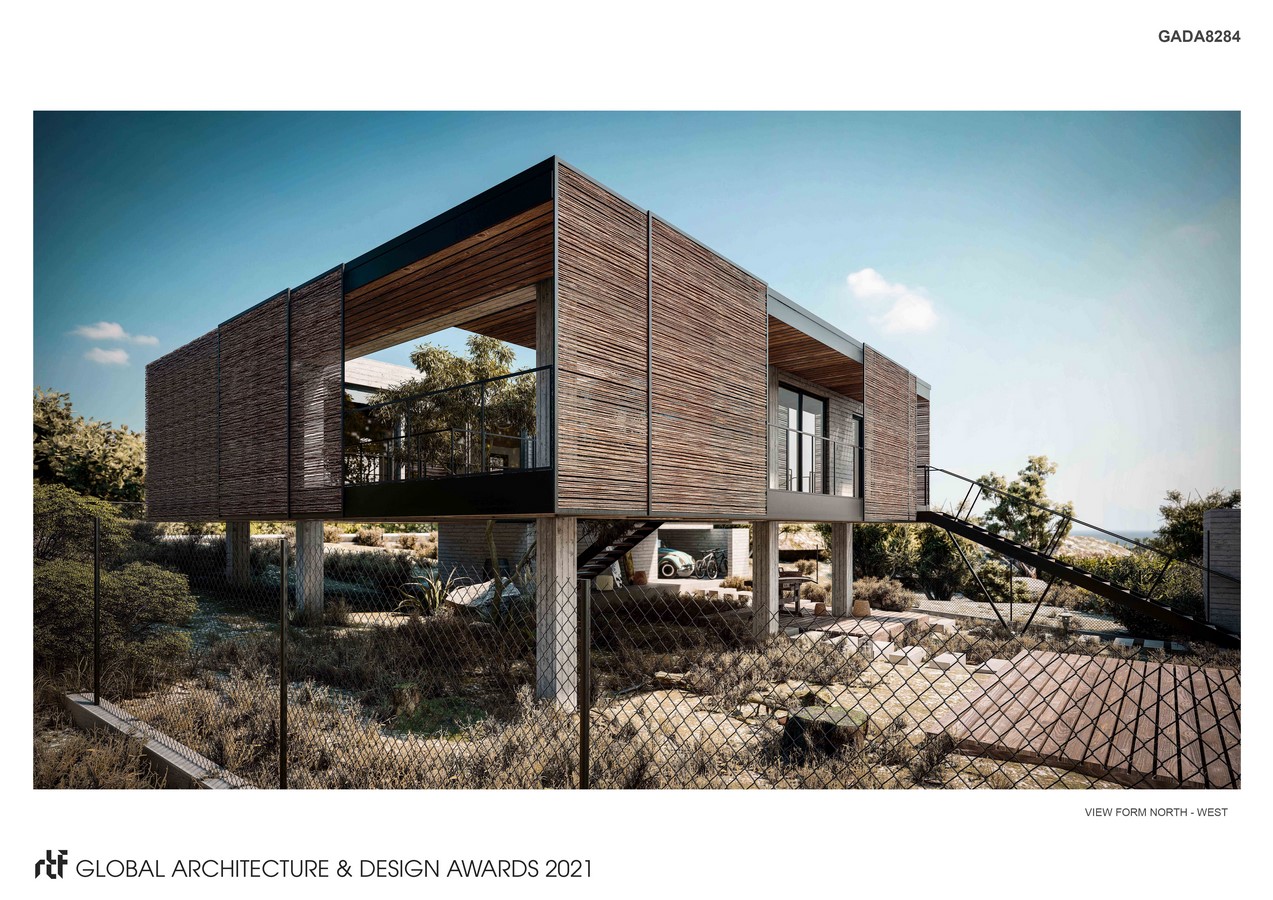 The design suggests living in between the inside and outside space. Plants and rocky fields are captured by the structure and let rest into living spaces. The construction’s ground imprint is minimized in order to preserve the local microclimate and natural flora.