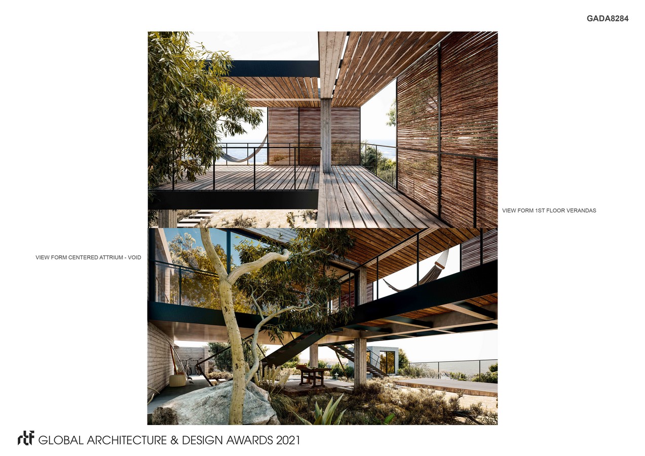 A centered void visually and functionally connects the 1st floor’s closed spaces and verandas with the shaded natural ground of the “pilotis” where the surfer spends his time in an outdoor workshop.