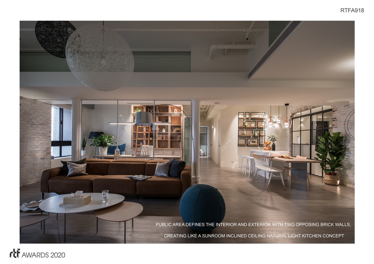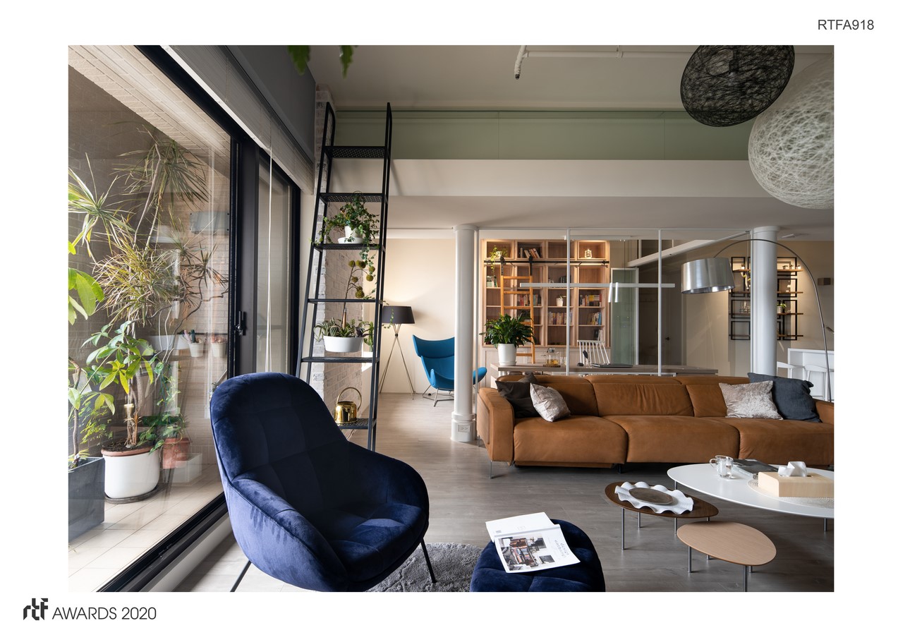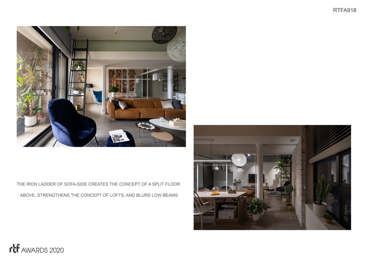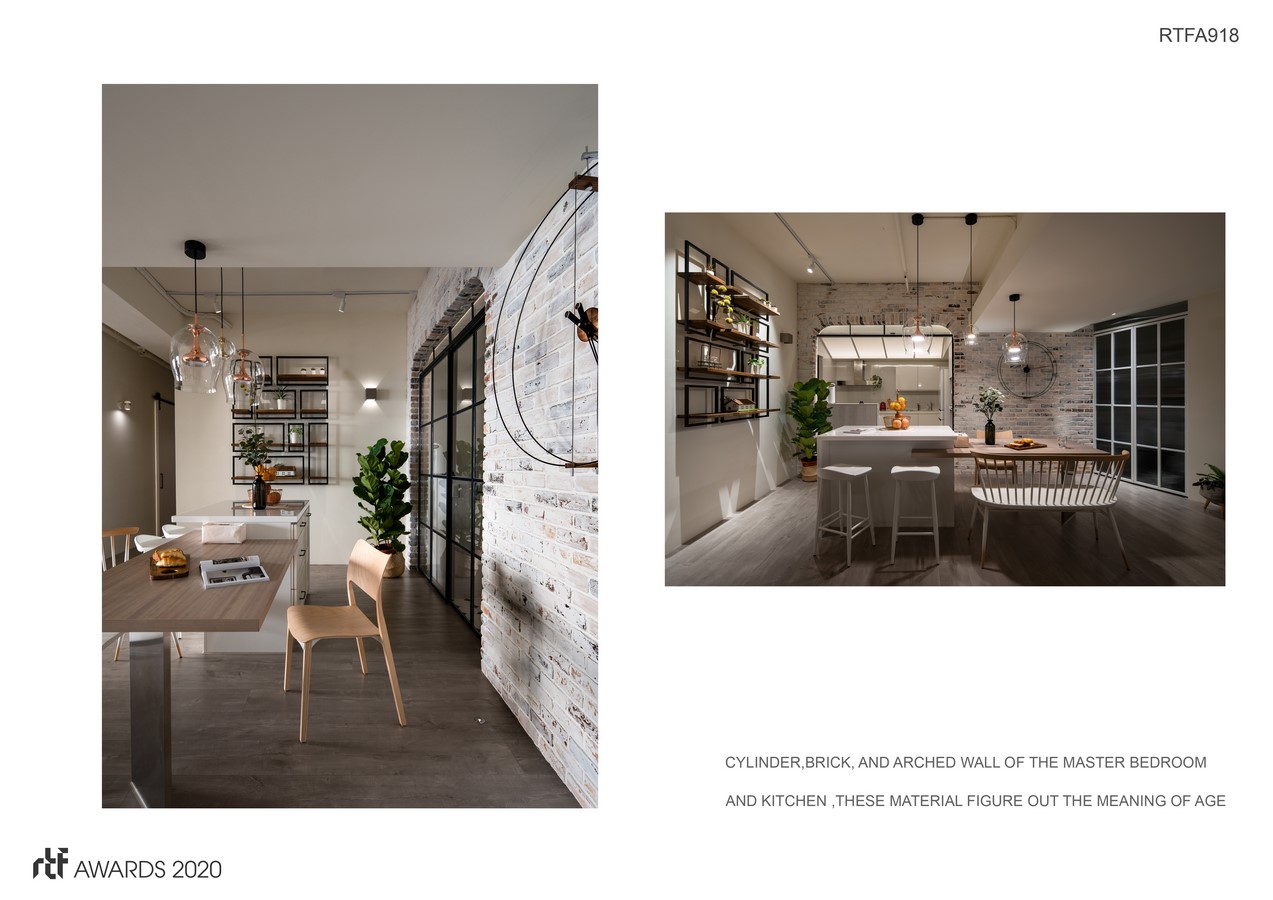 The iron ladder of sofa-side creates the concept of a split floor above, strengthens the concept of lofts, and blurs low beams. Cylinder, brick, and arched wall of the master bedroom and kitchen, these material figure out the meaning of age.