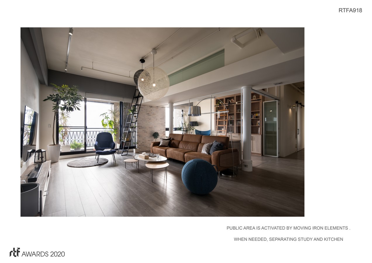 The public area is activated by moving iron elements. When needed, separating study and kitchen. The public area defines the interior and exterior with two opposing brick walls, creating like a sunroom inclined ceiling natural light kitchen concept.