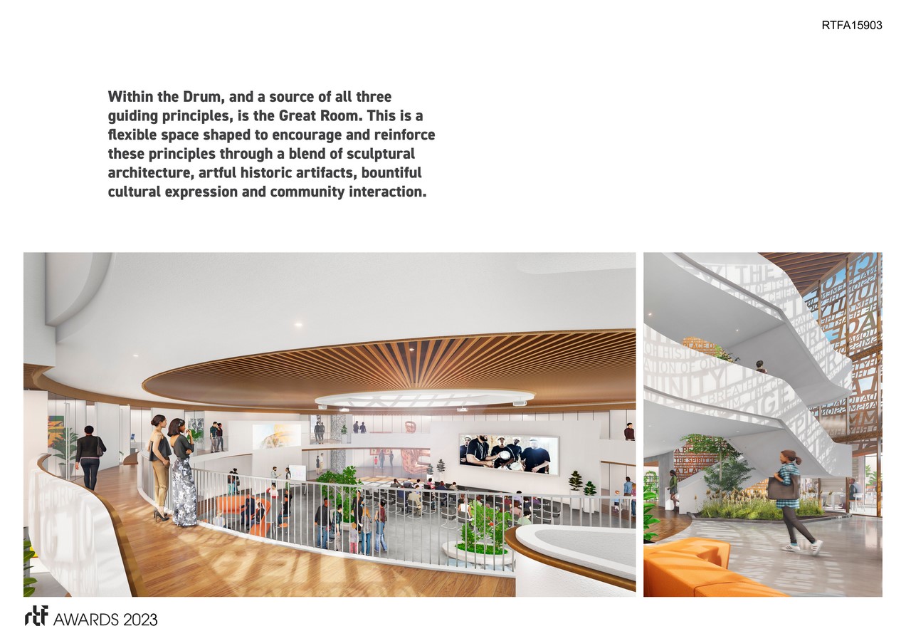 Seeded within The Drum is the Great Room, designed to reinforce the guiding principles through sculptural architecture, historic artifacts, cultural expression, and community interaction The flexible space, wrapped warmly by the exterior “walls of meaning” screen system, can host a variety of programs and gatherings, providing essential resources for learning, creativity, and collaboration that can meet the evolving needs of the community.