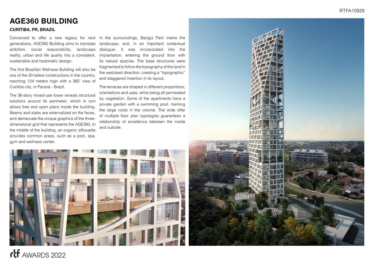 The 36-story mixed-use tower reveals structural solutions around the perimeter, which in turn allows free and open plans inside the building. Beams and slabs are externalized on the faces, and demarcate the unique graphics of the three-dimensional grid that represents the AGE360. The residential units have areas between 200 and 560m², with terraces shaped in different proportions, orientations and uses. The wide offer of multiple floor plan typologies guarantees a relationship of excellence between the inside and outside. In the middle of the building, an organic silhouette provides common areas for residents, such as a pool, spa, gym and wellness center.