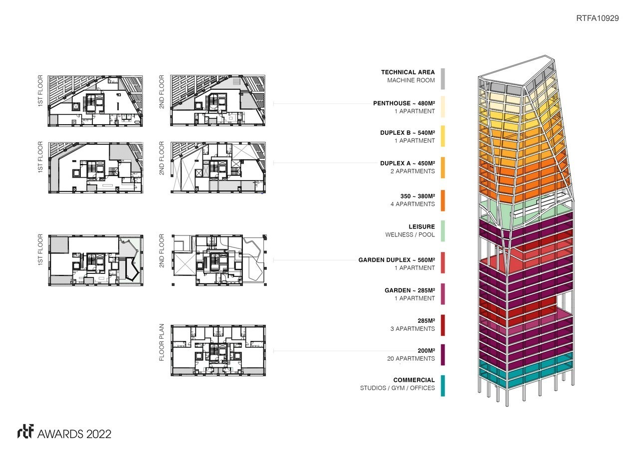 The existing park extends from the ground floor to the top of the building, permeated by vegetation on all facades. Some apartments have a private garden with a swimming pool, marking the large voids in the volume.