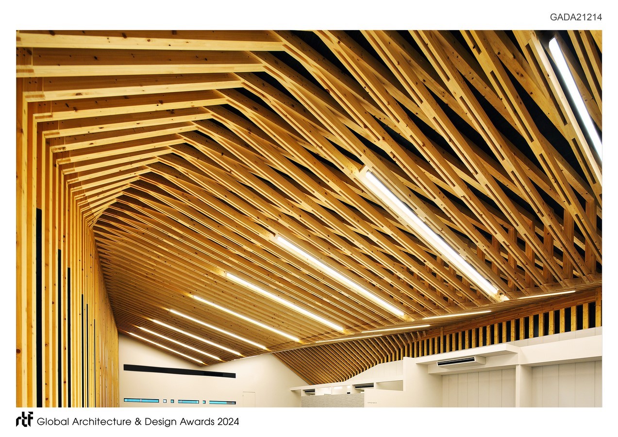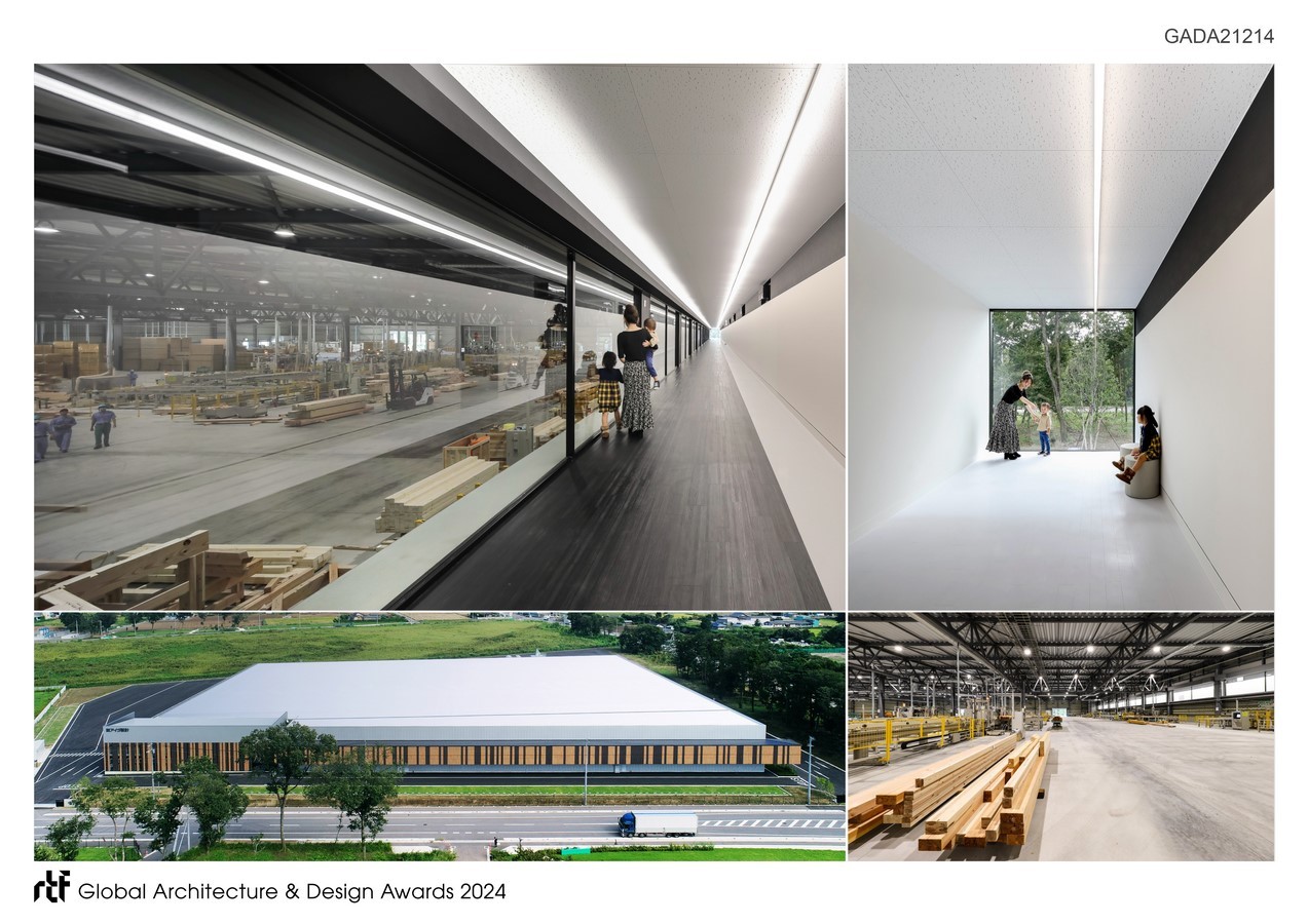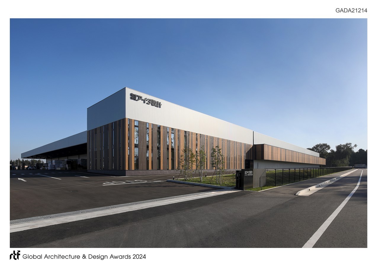 The idea of this architectural design was to manifest the corporate identity of Aida sekkei Co.,Ltd. and to deliver the inspiration for its future. In order to do so, several portions of mass were moved slightly from huge mass of 130 meter by 100 meter by 10 meter to create subtle contrast in space. While being quite simple and practical space layout, this method enables each space to function as viewing aisle, truck berth with deep and wide canopy, office, etc. As for the office, which is the face of the plant, we created one large space by building scissor truss using members of smaller cross section (30 mm by 120mm size lumber used as supplementary member such as wall stud of a home). 120mm square Japanese cypress pillars are placed every 303 mm of the wall and to construct load bearing walls, a 30 mm thick cedar board was inserted between the pillars.