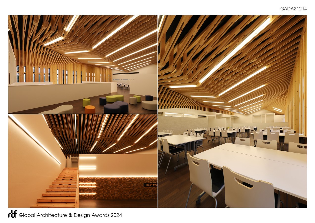All of the wooden elements in the office being left bare, they also serve as display for the house builder’s technique of precut in showroom.Almost 100 meters long viewing aisle encased in random stripe wooden shell is cantilevered and appears as if it floats from the factory building wall. The aim of the impressive façade design with a sense of acceleration and speed is to provoke the image of Aida sekkei’s further evolution towards the future.
