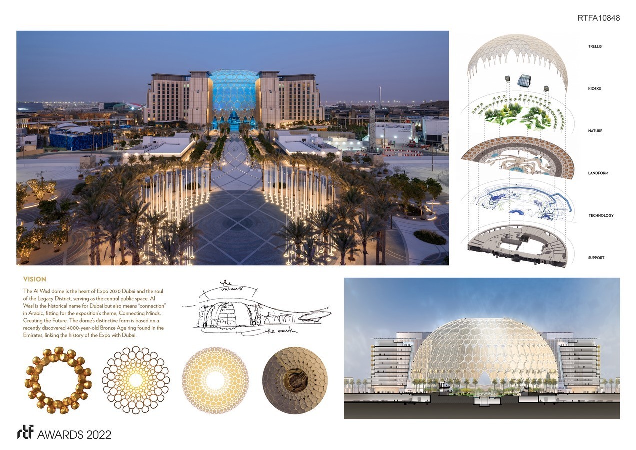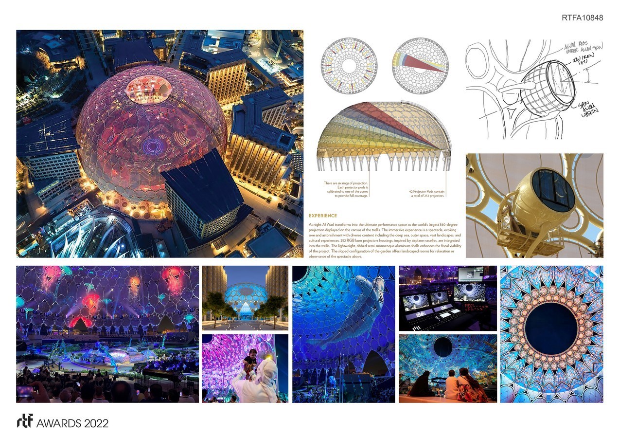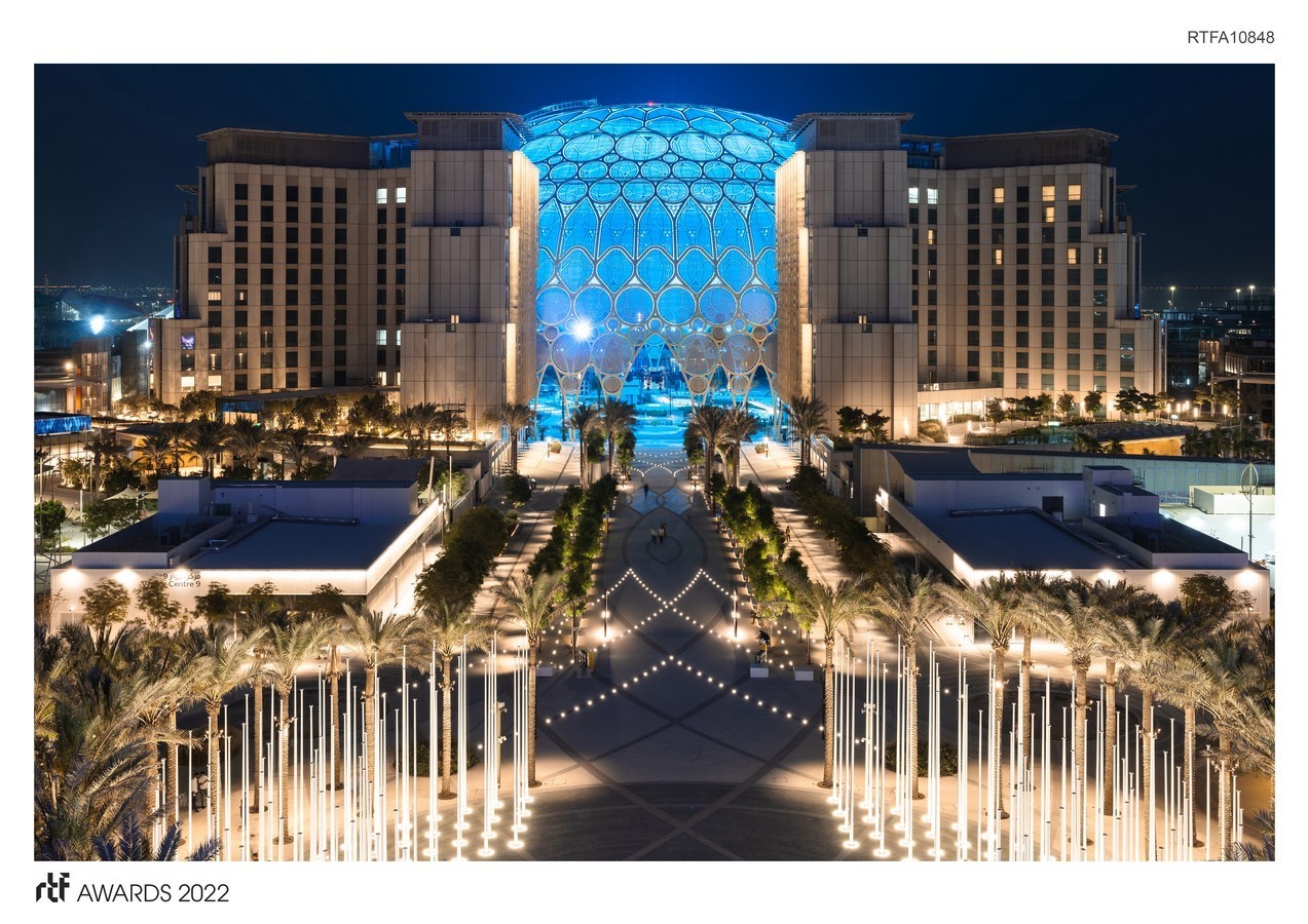 The scale and rich detail of the Al Wasl dome provides a cultural reference for its district and its city. Its natural environment promotes an urgent re-encounter with nature. Its technology enhancements offer possibilities to reach limitless potential for communication, education, and cultural experiences. With its distinguishable features, the Al Wasl dome provides a culturally, environmentally, and timely sense of space for the local community to enjoy and embrace with a global outreach.