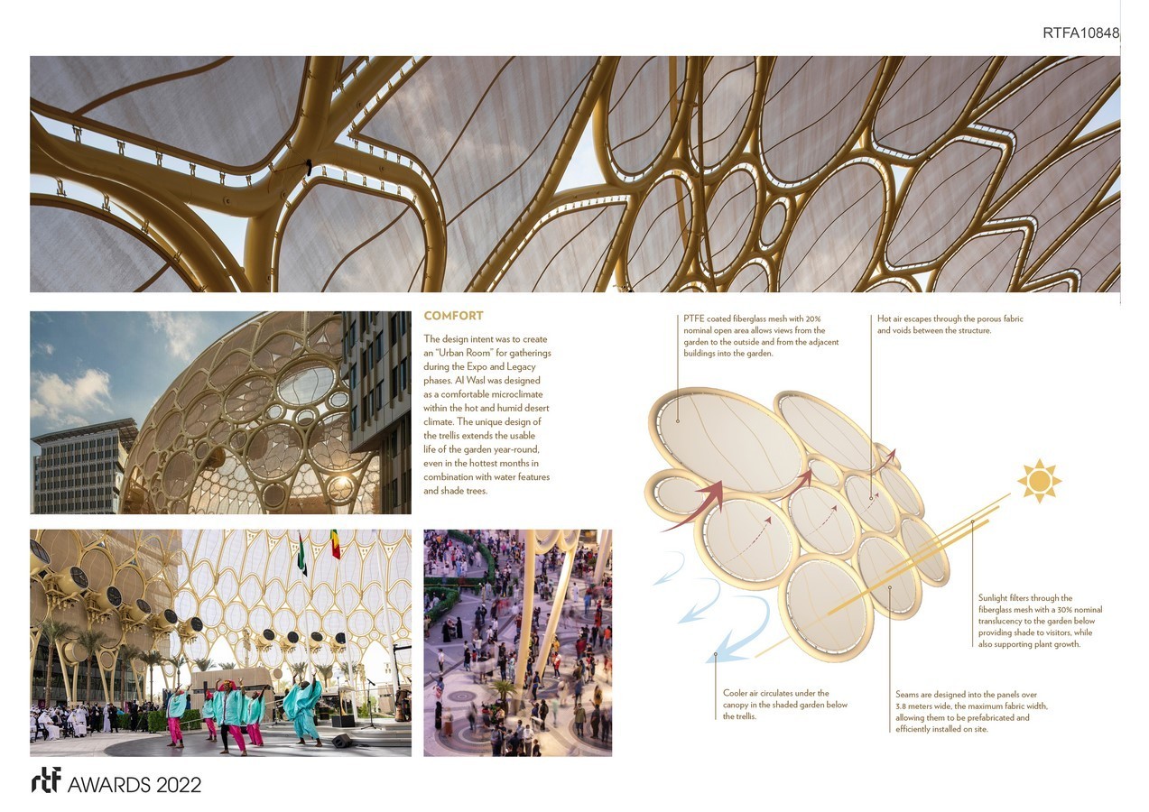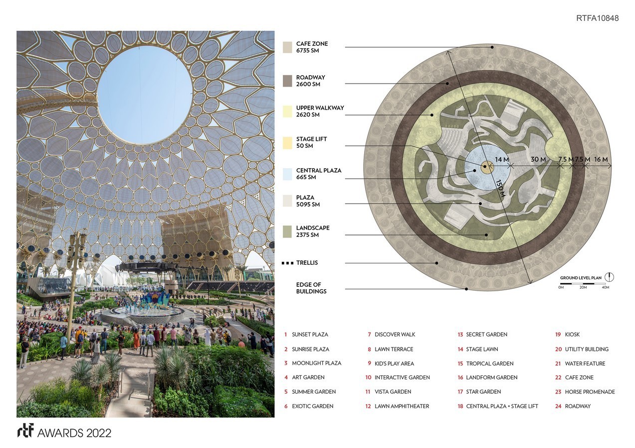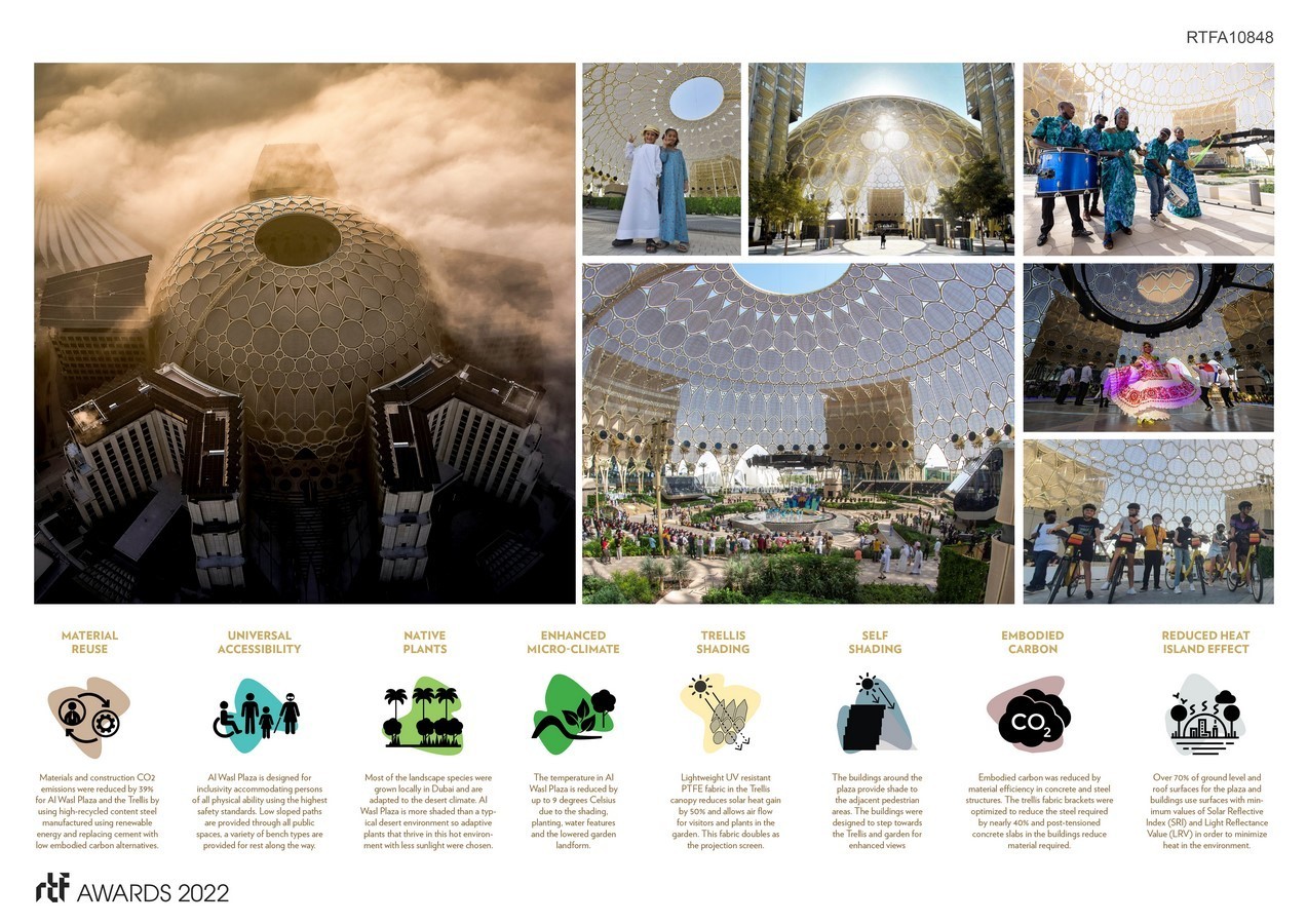 The scale and rich detail of the Al Wasl dome provides a cultural reference for its district and its city. Its natural environment promotes an urgent re-encounter with nature. Its technology enhancements offer possibilities to reach limitless potential for communication, education, and cultural experiences. With its distinguishable features, the Al Wasl dome provides a culturally, environmentally, and timely sense of space for the local community to enjoy and embrace with a global outreach.