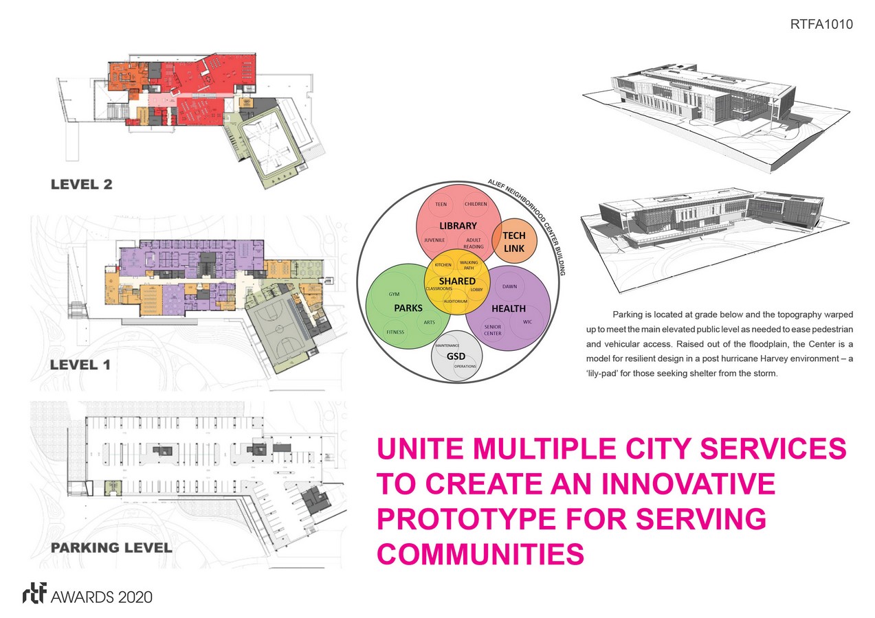 The Alief Neighborhood Center combines three City of Houston departments (Library, Parks, & Health) to create a civic center at the heart of the redeveloped 37-acre urban park. Raised out of the floodplain, the building’s elevated ‘front porch’ frames a space for the diverse community to come together, share ideas, and express an identity unique to Alief. The Center is a model for resilient design in a post-hurricane Harvey environment – a ‘Lilly-pad’ for those seeking shelter from the storm.