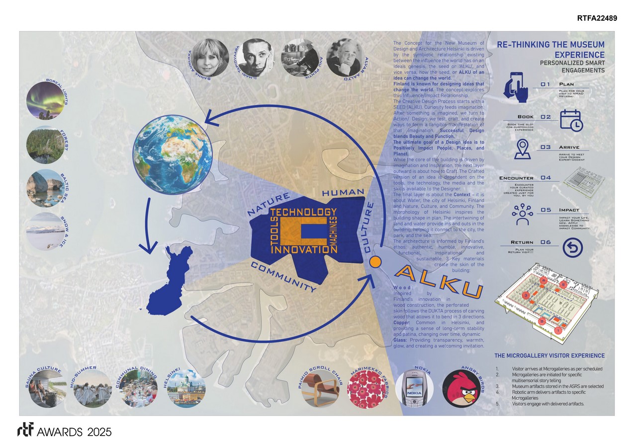 The New Museum of Design and Architecture Helsinki Concept is driven by the symbiotic relationship existing between the influence the world has on an idea’s genesis, [the ‘seed’ or ‘ALKU’ (in Finish)], and vice versa, how the ‘ALKU’ of an idea can change the world. The concept explores this Influence/Impact Relationship.