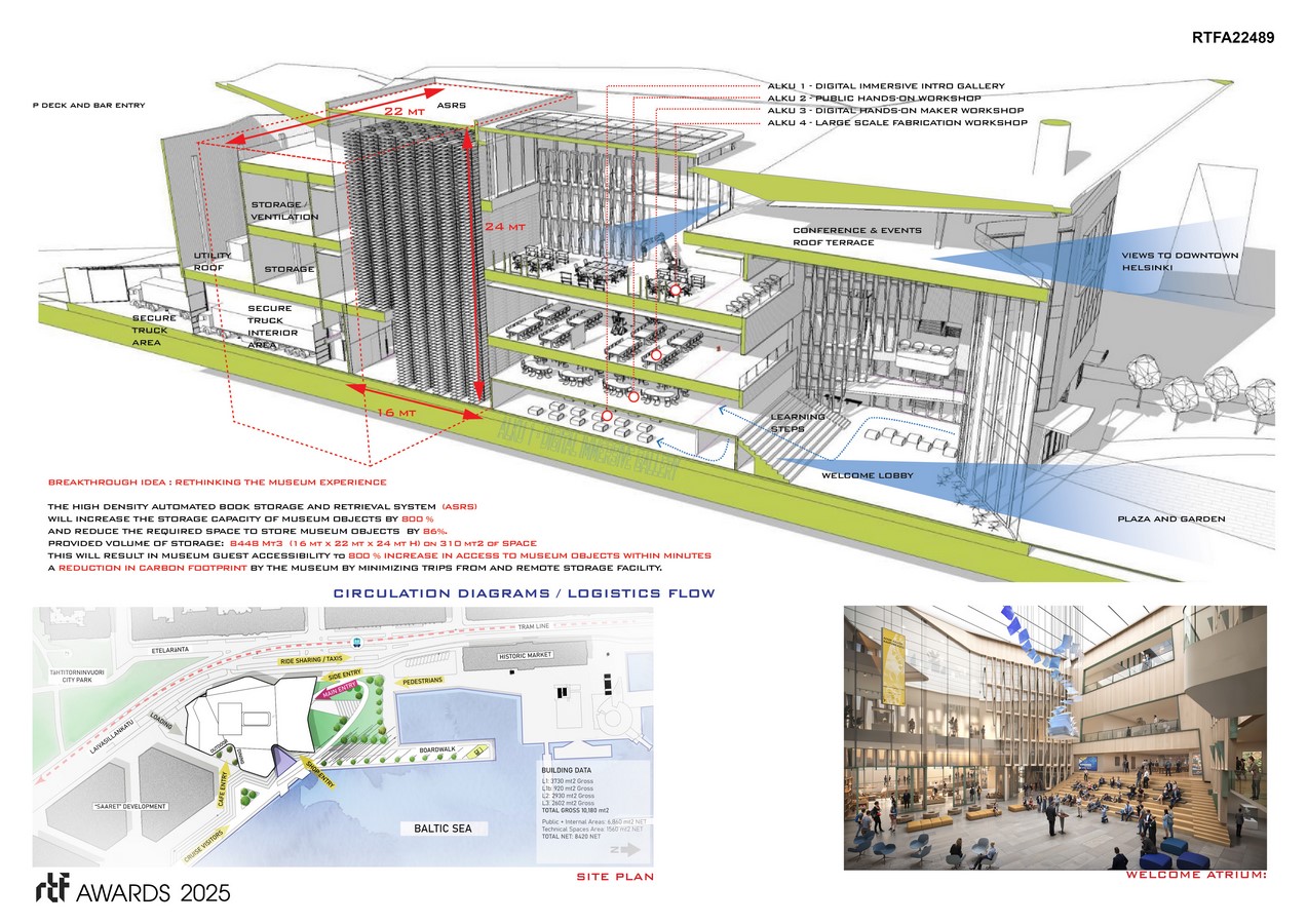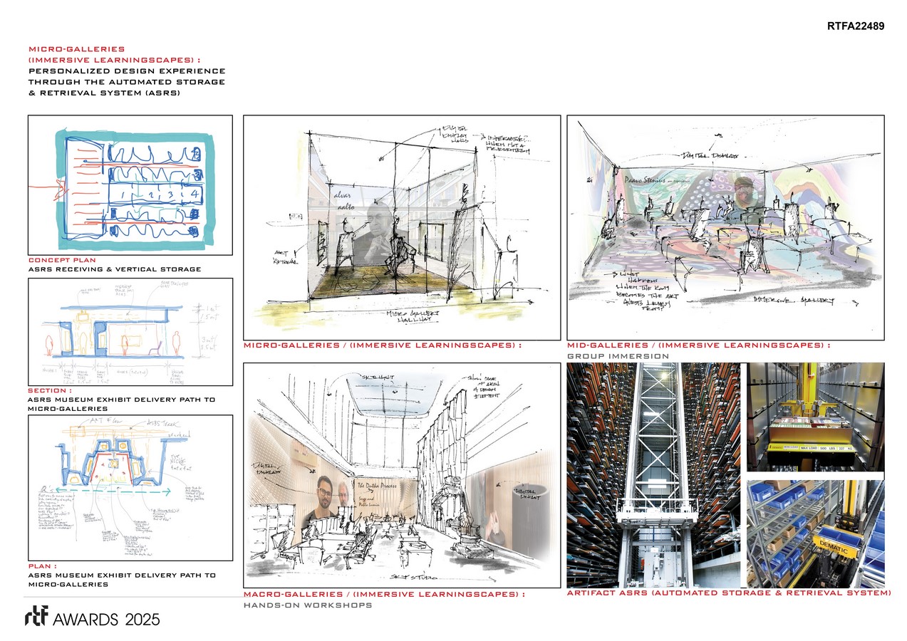 Act 2: Upon the Patron’s arrival to the Museum, a personalized welcome experience with museum staff continues with an Immersive Learningscape visit: A multisensory storytelling experience bringing the artist’s work alive through digital arts, the work’s ALKU, the idea’s evolution and development, and the actual artifact selected during planning on the App on Act 1. The transformative idea behind this design is the artifact’s delivery to the Immersive Learnignscape via an ASRS (Automated Storage and Retrieval System): a robotic technology storing 9x the number of Museum artifacts in 1/7 of the area and with capacity to deliver a specific museum artifact to a patron via robotic channels and through pre-programmed pathways. This combination of customization, immersiveness, multisensorial storytelling, and personal engagement with highly valuable artifacts in a personalized Learningscape is a Museum Experience never before accomplished in the world.