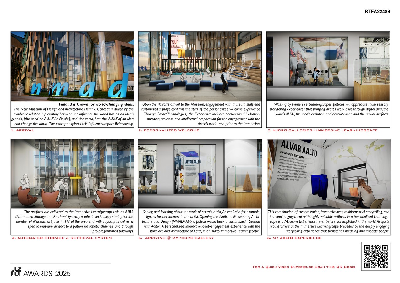 Act 1: Starts at Home, at school, at a studio, reading a book, seeing an image. Seeing and learning about the work of certain artist, Aalvar Aalto for example, ignites further interest in the artist. Opening the National Museum of Architecture and Design (NMAD) App, a patron would book a customized “Session with Aalto”, A personalized, interactive, deep-engagement experience with the story, art, and architecture of Aalto, in an ‘Aalto Immersive Learningscape’.