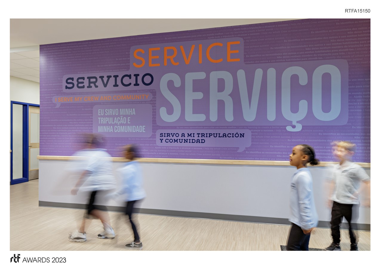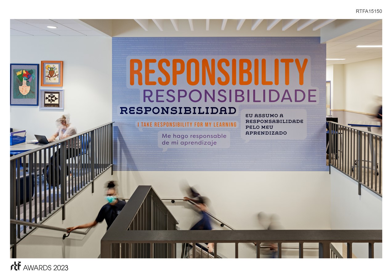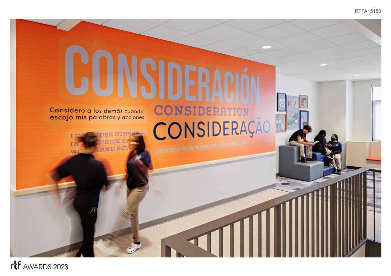 The graphics were created in tandem with the architecture, resulting in a cohesive and purposeful design that aligns with the school’s culture and mission. Each element of the graphics program is imbued with significance that reflects the school’s unique identity and its aspirations.
