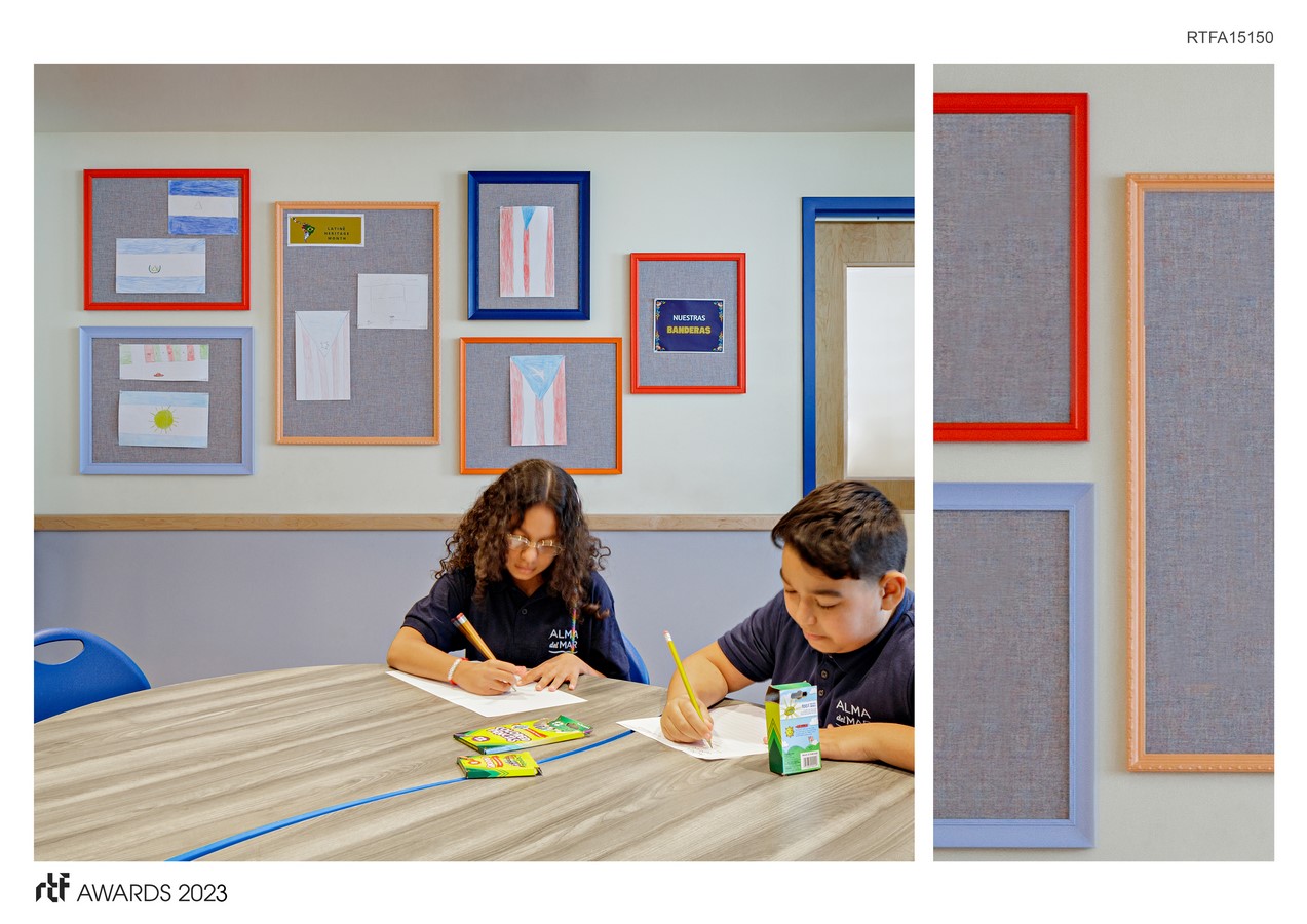 changeable gallery system: To add life to the hallways, community areas, and library, a versatile gallery system was created to showcase student artwork and school events. Equipped with a pin-friendly surface, the frames allow for the display of changing artwork and information about school events, promoting interaction and community spirit. The colors of the frames are harmoniously integrated with the interior design of the building.