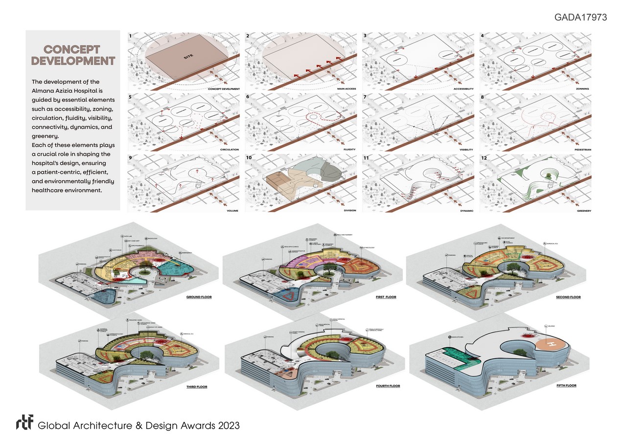 Almana hospital boasts a capacity of 200 beds, 75 clinics, and ample parking for 600 cars. It provides round-the-clock emergency services, a wide range of outpatient clinics specializing in various medical fields, a comprehensive Laboratory and Pathology Department, and advanced Radiology services. The facility is also equipped with cutting-edge medical imaging and robotic equipment, emphasizing both efficiency and accuracy. The design prioritizes energy efficiency, aiming for a minimum of 50 percent energy reduction compared to similar facilities while exceeding current health standards. Furthermore, the design establishes distinct zones for various activities, strategically locating departments and functions based on access proximity, flow, and wayfinding.