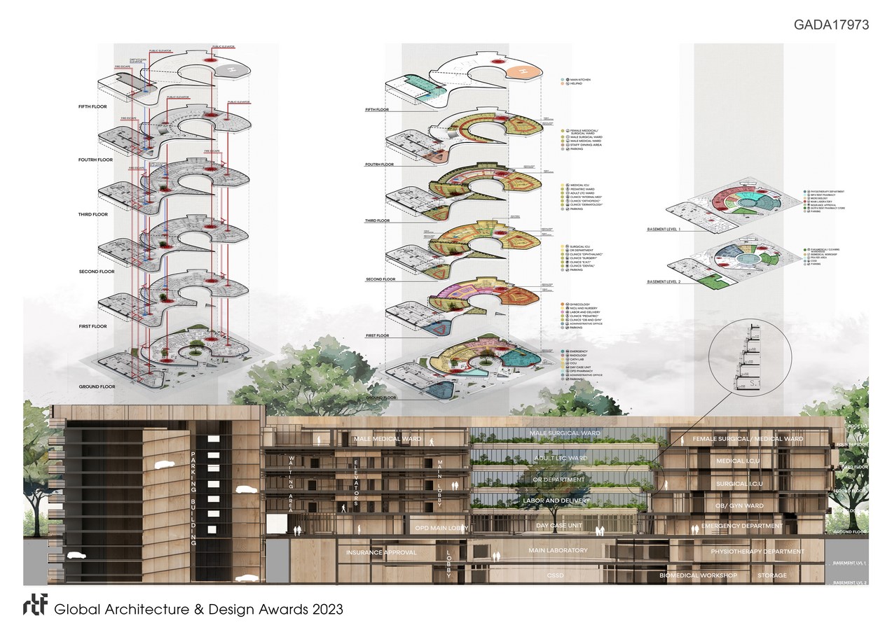 The hospital’s design is meticulously crafted to foster a welcoming, calming atmosphere that offers hope and healing to patients and visitors. It integrates functionality and efficiency, guided by the principles of Evidence-Based Design (EBD) and a strong commitment to sustainable development goals (SDGs). Hence, it has embraced eco-friendliness and timeless aesthetics. The building’s graceful curves facilitate a seamless flow of space, forms, and elements that are dynamic and harmonious, promoting a profound connection with nature. This holistic approach ensures an exceptional experience.