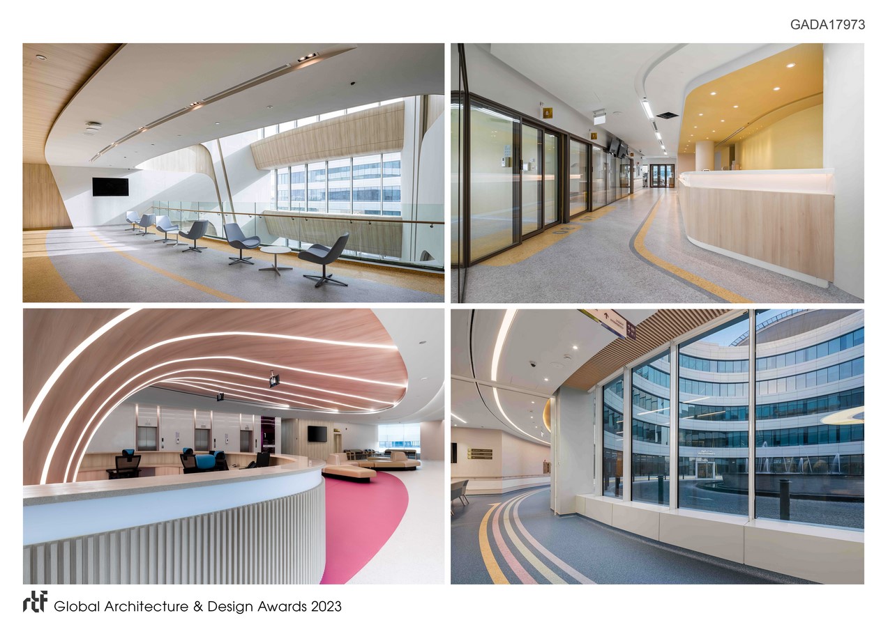 The design prioritizes fluidity and seamless movement to create a self-explanatory experience for visitors. The gentle curves in the architecture serve as natural guides, intuitively directing visitors throughout the space. Additionally, the hospital features a grand lobby with a strong public presence and multilevel space that ensures a welcoming transition into the care environment. It leverages elements like atriums and skylights, humanistic scale, intuitive pathways, and clear signage for efficient wayfinding. The design also focuses on creating uncluttered and inviting spaces, employing wood, colors define departments, glass doors and glass slits to illuminate and organize rooms, muted and warm color palette, and clean design elements to define departments and enhance the overall atmosphere.