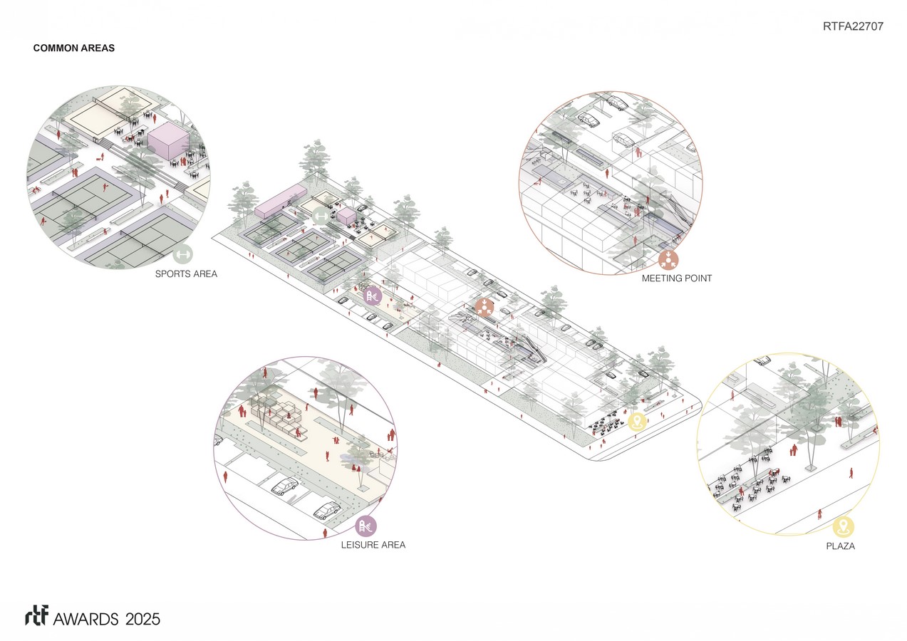 Conceived as a mixed-use program to promote integration, the project is organized around two main anchors: one composed of stores, commercial centers, work environments and a gym; and the other, a family center with outdoor sports courts. A large central square with trees welcomes visitors, intertwining leisure, services and commerce in a living space.