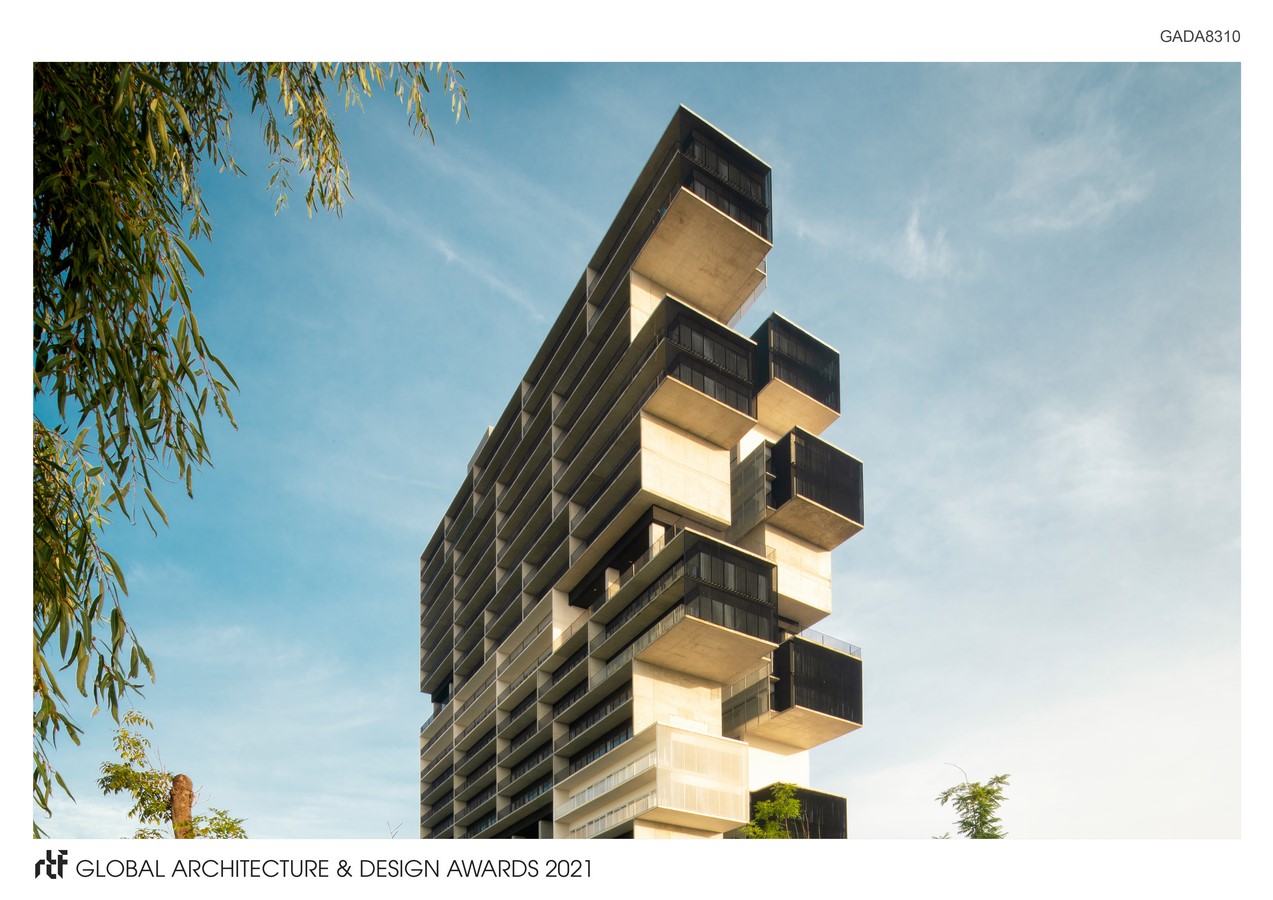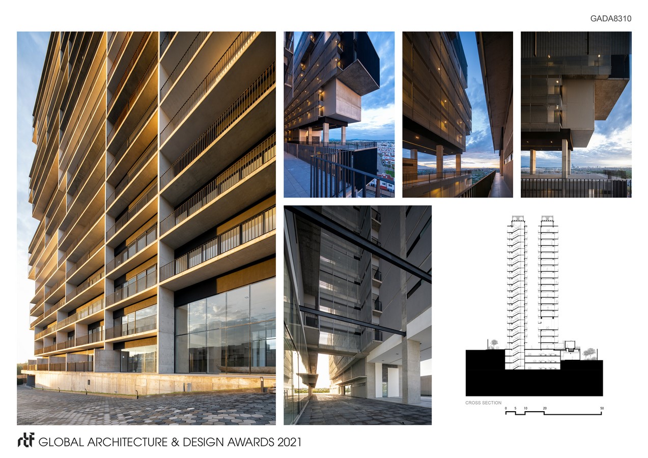 The 226 housing unit project incorporate 2 slender blocks that embody gaps in strategic levels, which house spaces for recreation and coexistence. These spaces are subtracted from the volume of the building, in such a way that each void frames fortunate views. The extremes of each building end in cantilever mirroring the aspect of puzzle pieces which aim to blur the interior-exterior relation and visually connect with the environment.