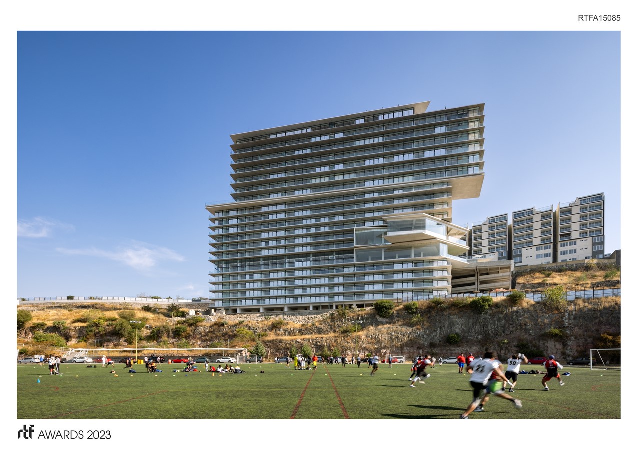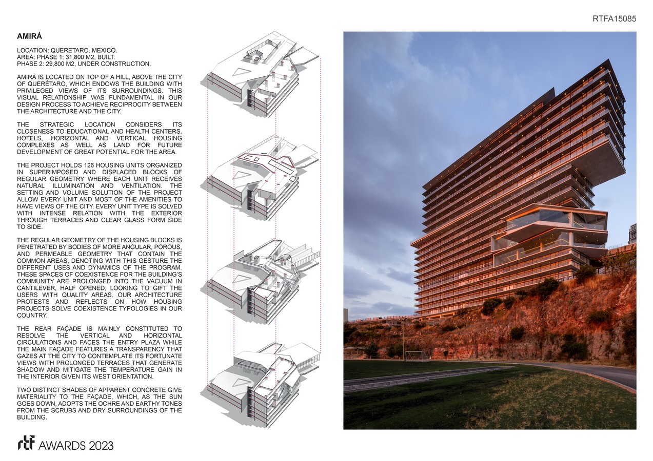 The project holds 126 housing units organized in superimposed and displaced blocks of regular geometry where each unit receives natural illumination and ventilation. The setting and volume solution of the project allow every unit and most of the amenities to have views of the city. Every unit type is solved with intense relation with the exterior through terraces and clear glass form side to side.