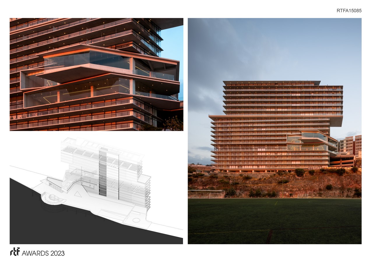 The rear façade is mainly constituted to resolve the vertical and horizontal circulations and faces the entry plaza while the main façade features a transparency that gazes at the city to contemplate its fortunate views with prolonged terraces that generate shadow and mitigate the temperature gain in the interior given its west orientation.
