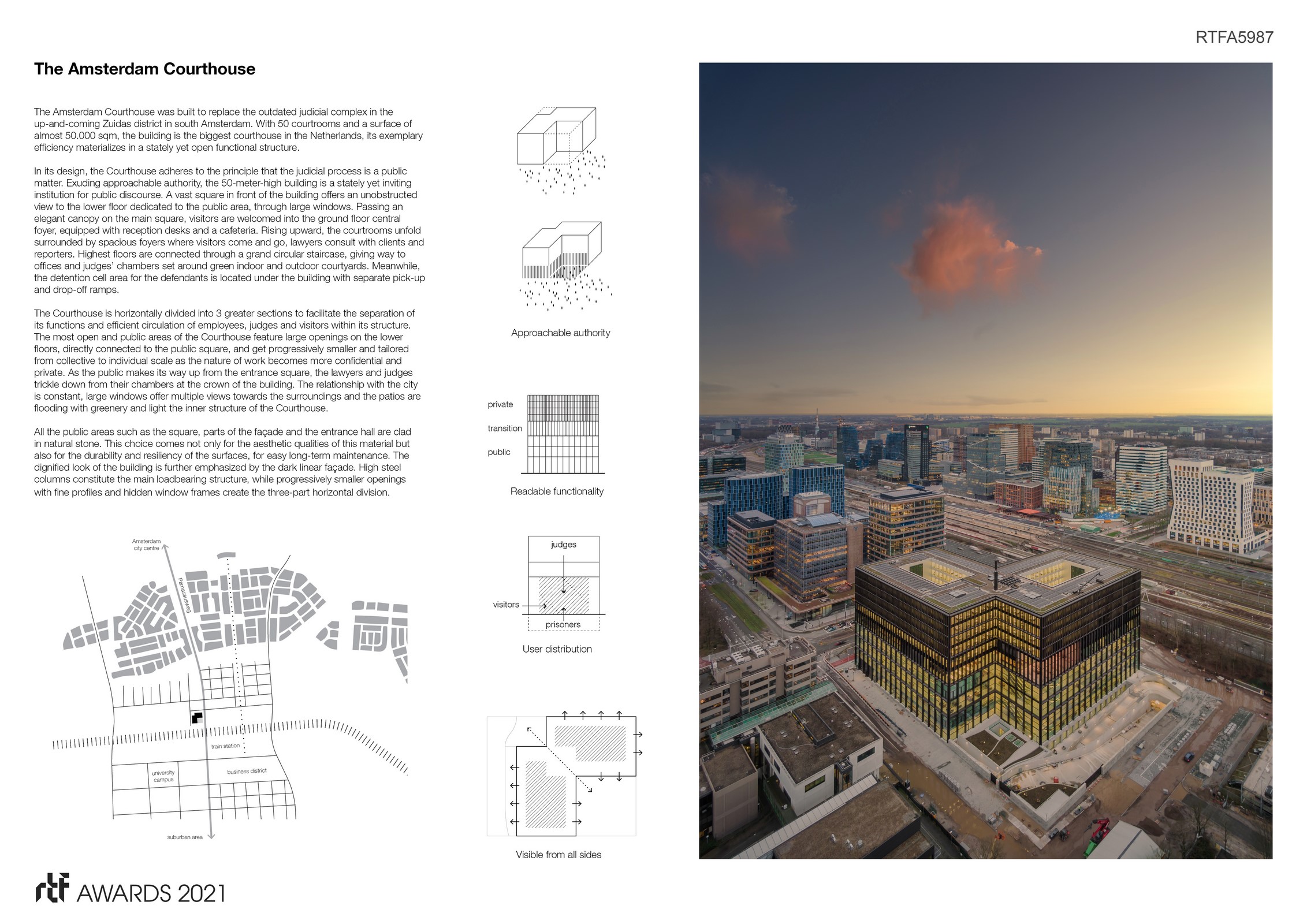 The Amsterdam Courthouse was built to replace the outdated judicial complex in the up-and-coming Zuidas district in south Amsterdam. With 50 courtrooms and a surface of almost 50.000 sqm, the building is the biggest courthouse in the Netherlands, its exemplary efficiency materializes in a stately yet open functional structure.