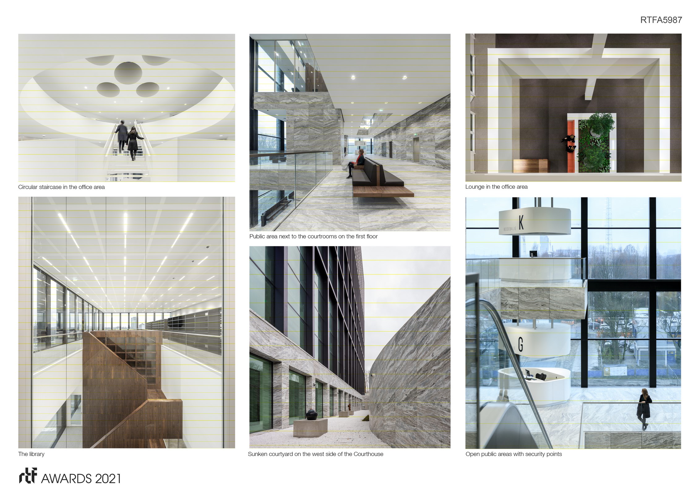 The Courthouse also features specifically commissioned original artwork – most noticeably the entrance square sculpture by Nicole Eisenman, and the courtroom artworks by Jesse Wine and Femmy Otten.