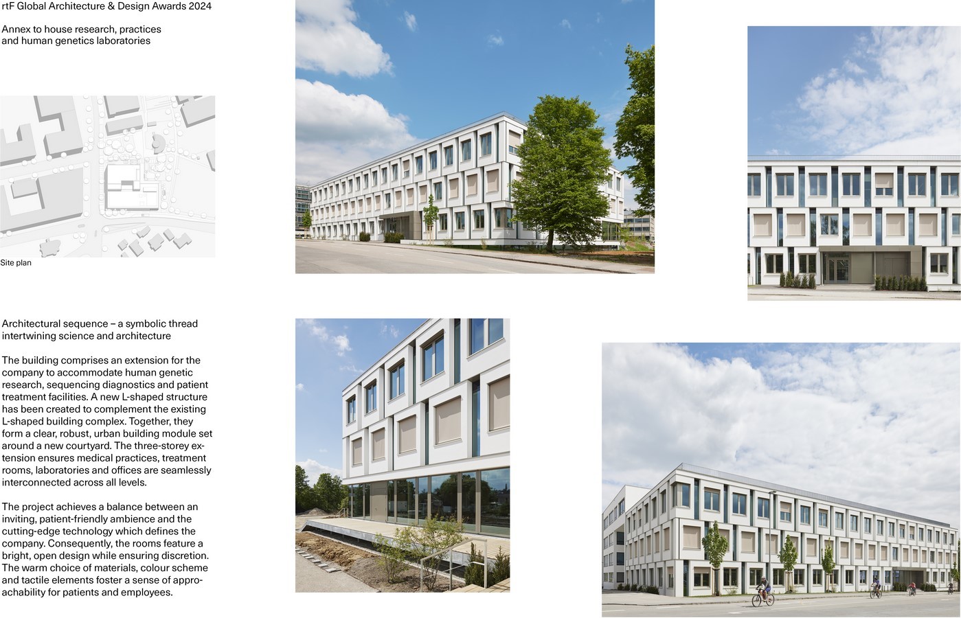 The building comprises an extension for the company to accommodate human genetic research, sequencing diagnostics and patient treatment facilities. A new L-shaped structure has been created to complement the existing L-shaped building complex.