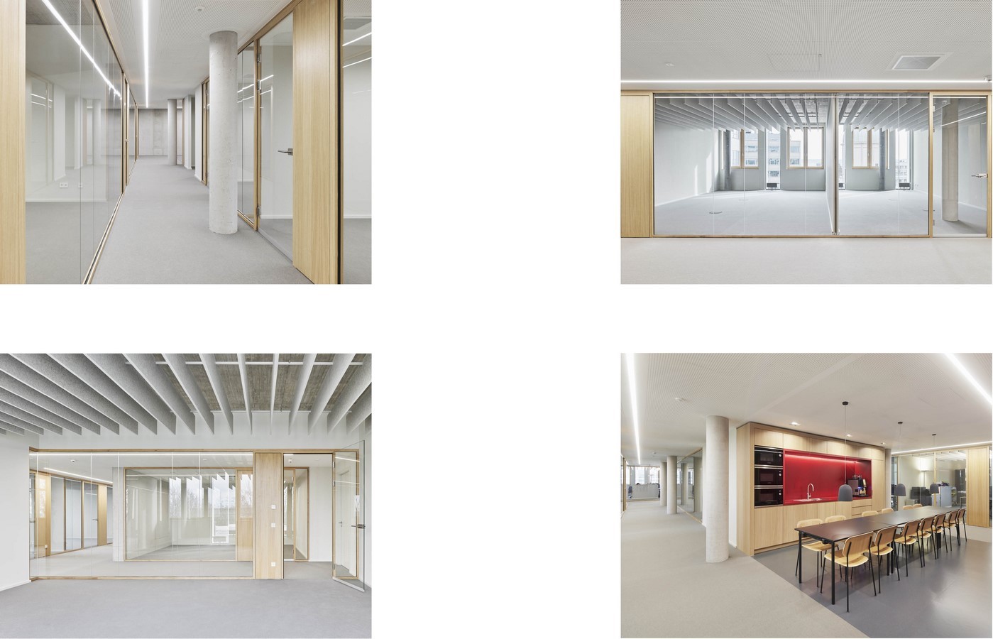 Consisting of kitchenettes, lounge areas and a cafeteria, the team zones are strung throughout the building like individual pearls along a chain. Highlighted in a striking, bold red, they contrast with the otherwise cohesive colour palette, denoting the identity-establishing communal zones in the different departments. The newly designed staircase acts as a connecting element that links these ‘pearls’ together. Its bold red banister resembles a ribbon, creating an overarching logic of room sequences that enhances spatial coherence.