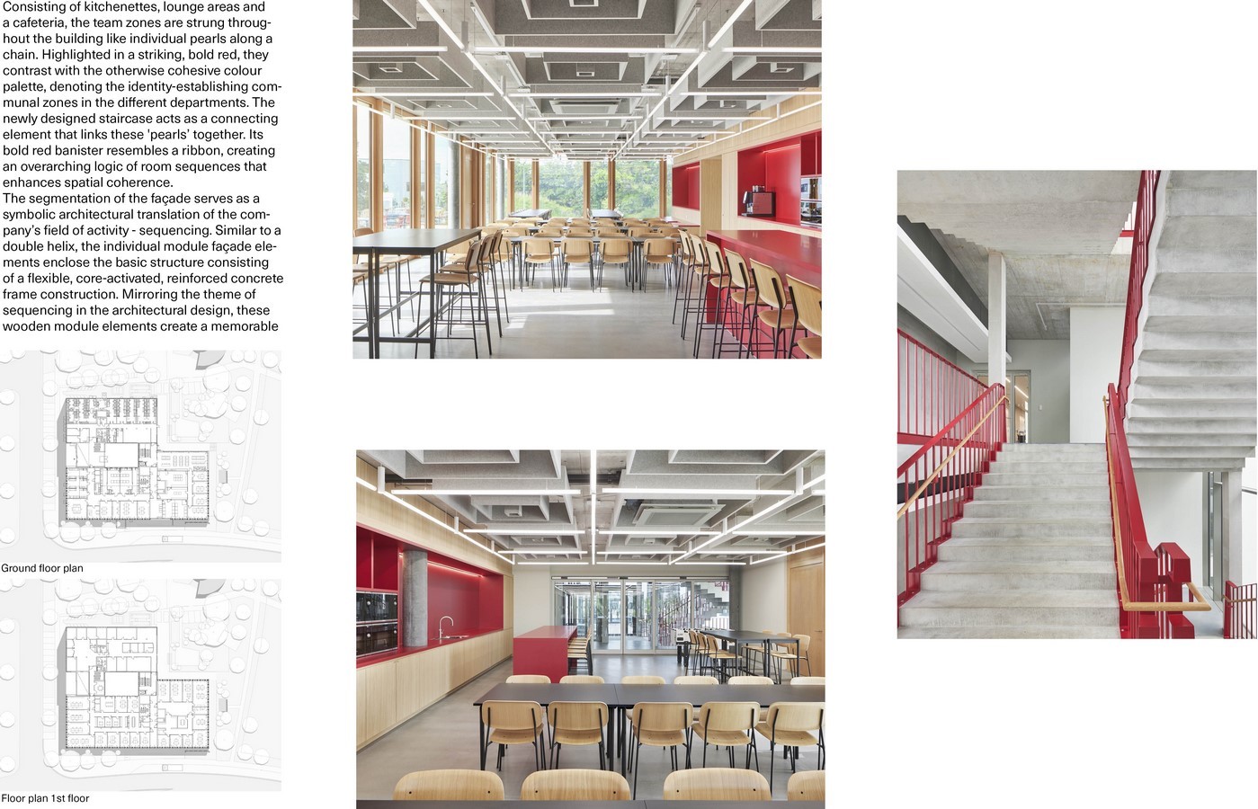 The segmentation of the façade serves as a symbolic architectural translation of the company’s field of activity – sequencing. Similar to a double helix, the individual module façade elements enclose the basic structure consisting of a flexible, core-activated, reinforced concrete frame construction. Mirroring the theme of sequencing in the architectural design, these wooden module elements create a memorable rhythm and herald the start of construction for the new Cybervalley research park in the city of Tübingen.