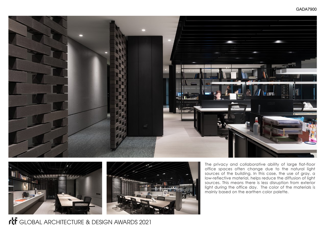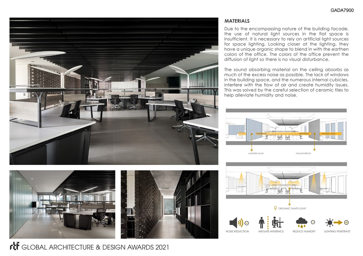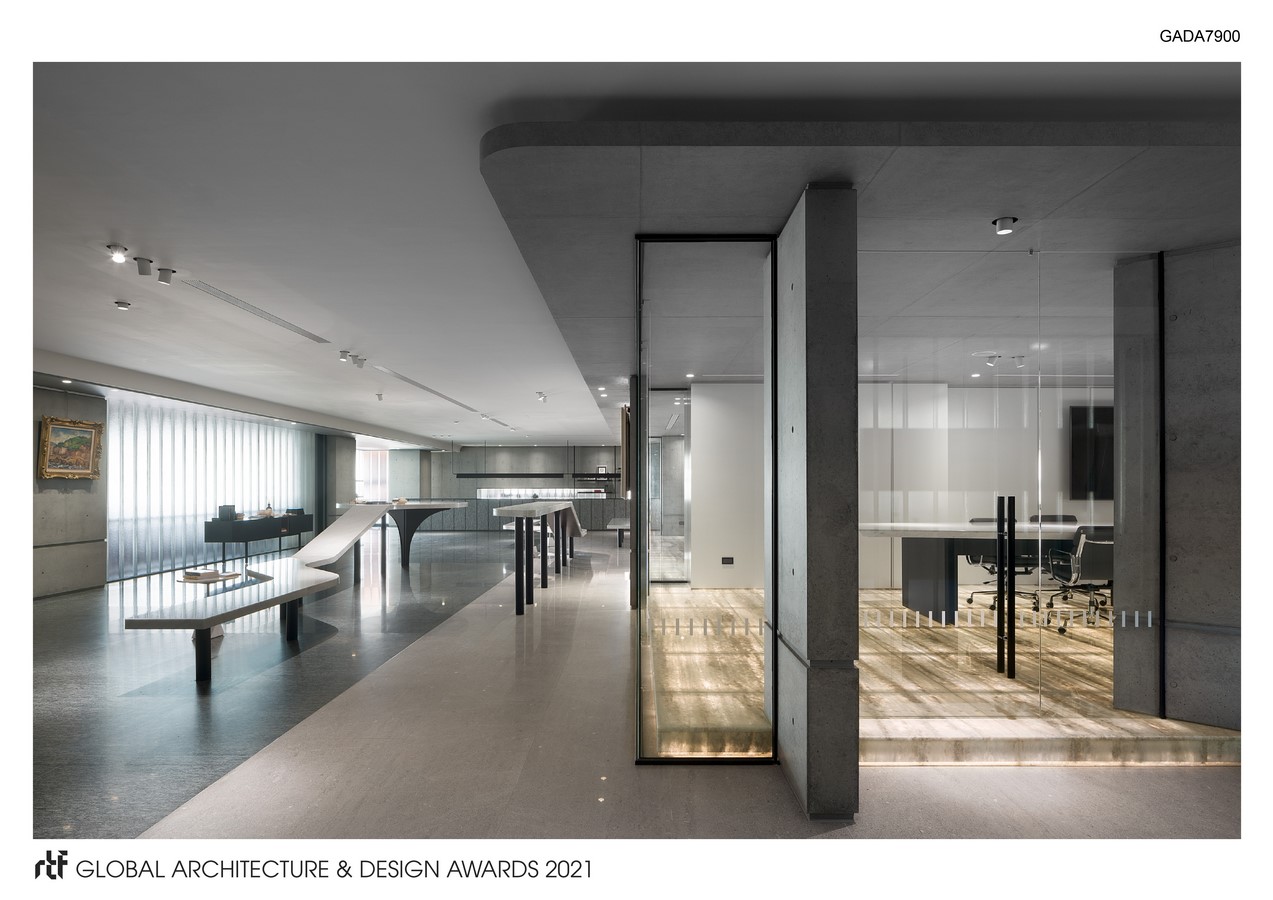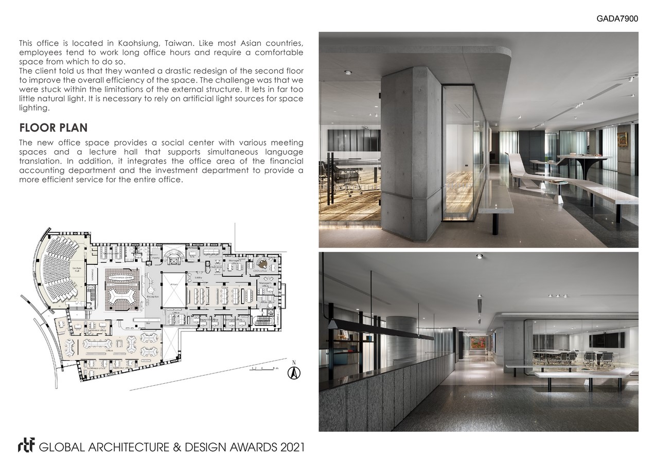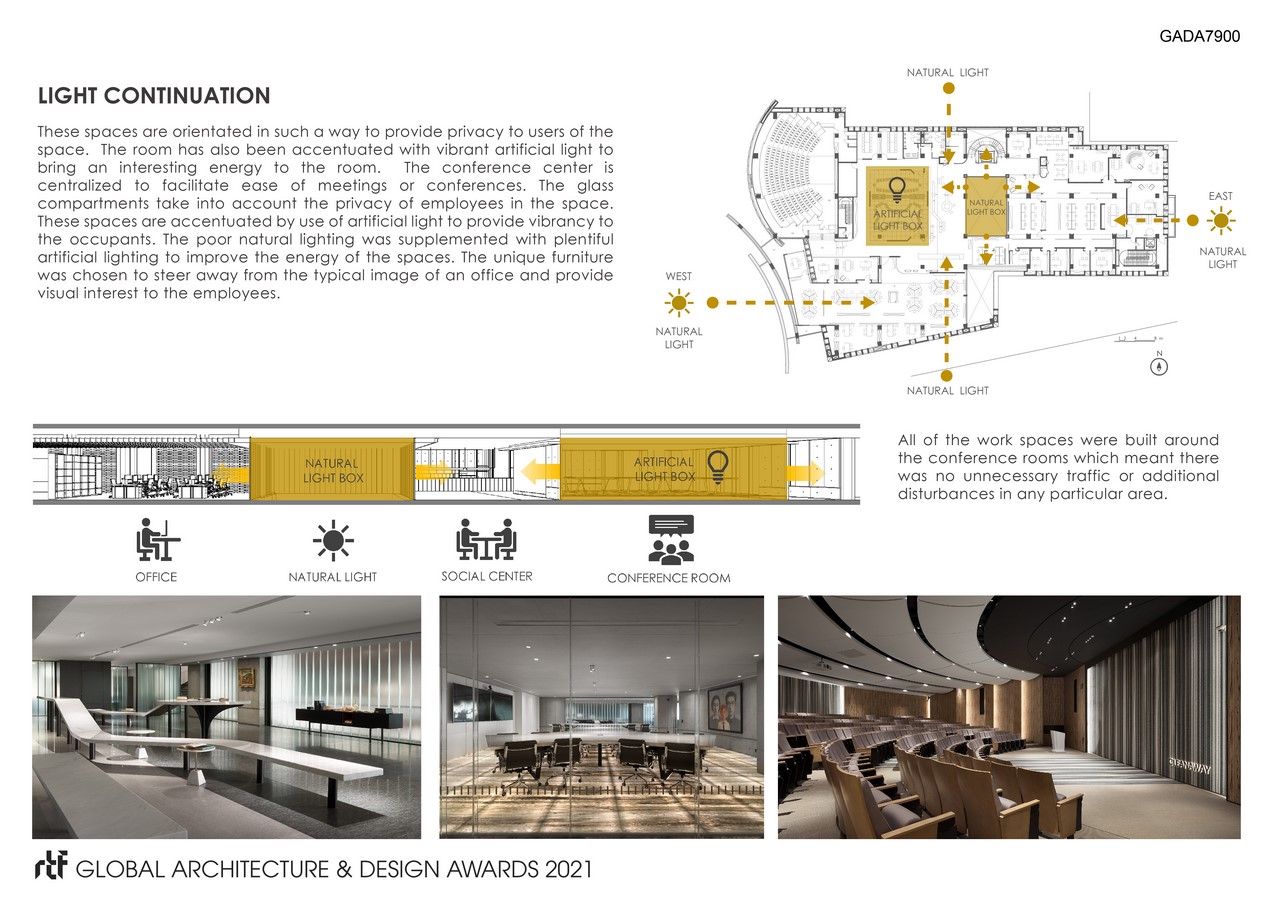 The new office space provides a social center with various meeting spaces and a lecture hall that supports simultaneous language translation. In addition, it integrates the office area of the financial accounting department and the investment department to provide a more efficient service for the entire office. All of the work spaces were built around the conference rooms which meant there was no unnecessary traffic or additionally disturbances in any particular area. The glass compartments take into account the privacy of employees in the space. These spaces are accentuated by use of artificial light to provide vibrancy to the occupants.