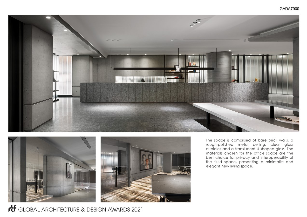 The space is comprised of bare brick walls, a rough-polished metal ceiling, clear glass cubicles and a translucent U-shaped glass. The materials chosen for the office space are the best choice for privacy and interoperability of the fluid space, presenting a minimalist and elegant new living space.