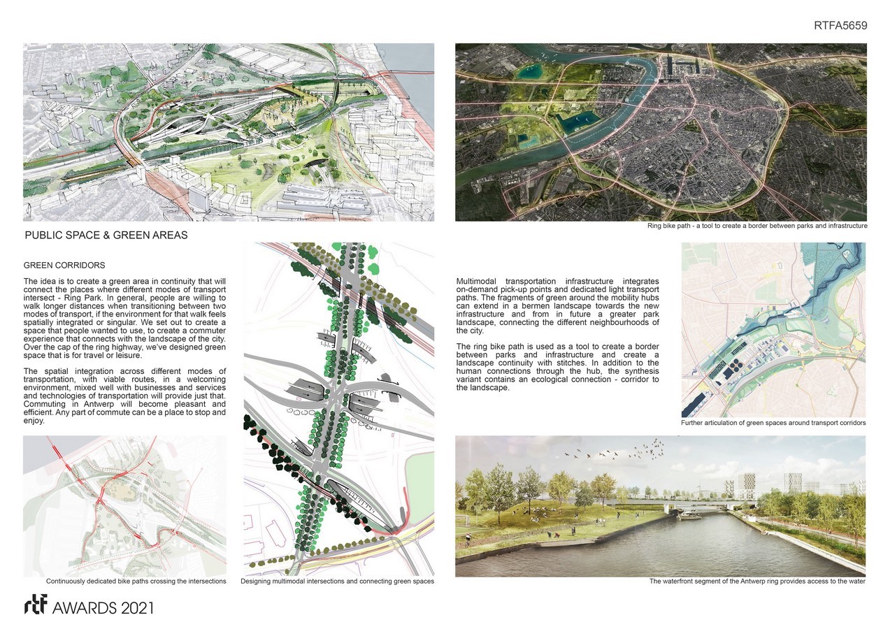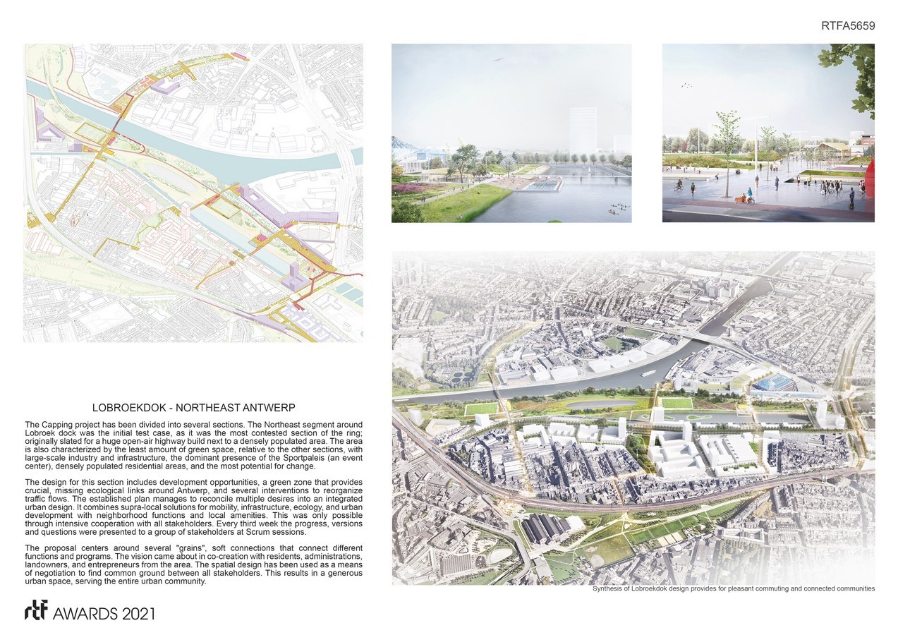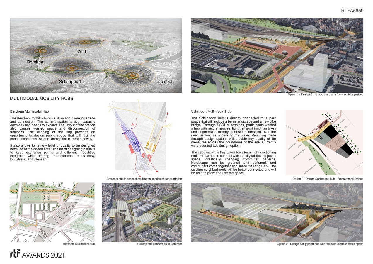 The capping process on the ring and the role of curatorial design have been an immense undertaking that includes many site-specific design projects: ORG developed a design for the North-East section of the CAP, the area around Lobroekdok, being defined by large scale industry and infrastructure, the dominant presence of the Sportpaleis and highly densified neighborhoods. The proposal concentrates around several ‘nerves’, connections that link different functions and programs. Large green spaces are located in between. In the first phase, cappings will be implemented at the Sportpaleis and Steenborgerweert. The Capping of the Ring also includes a comprehensive reimagining of the transportation network in Antwerp, including the design of Multi-modal Hubs and other transportation infrastructure.