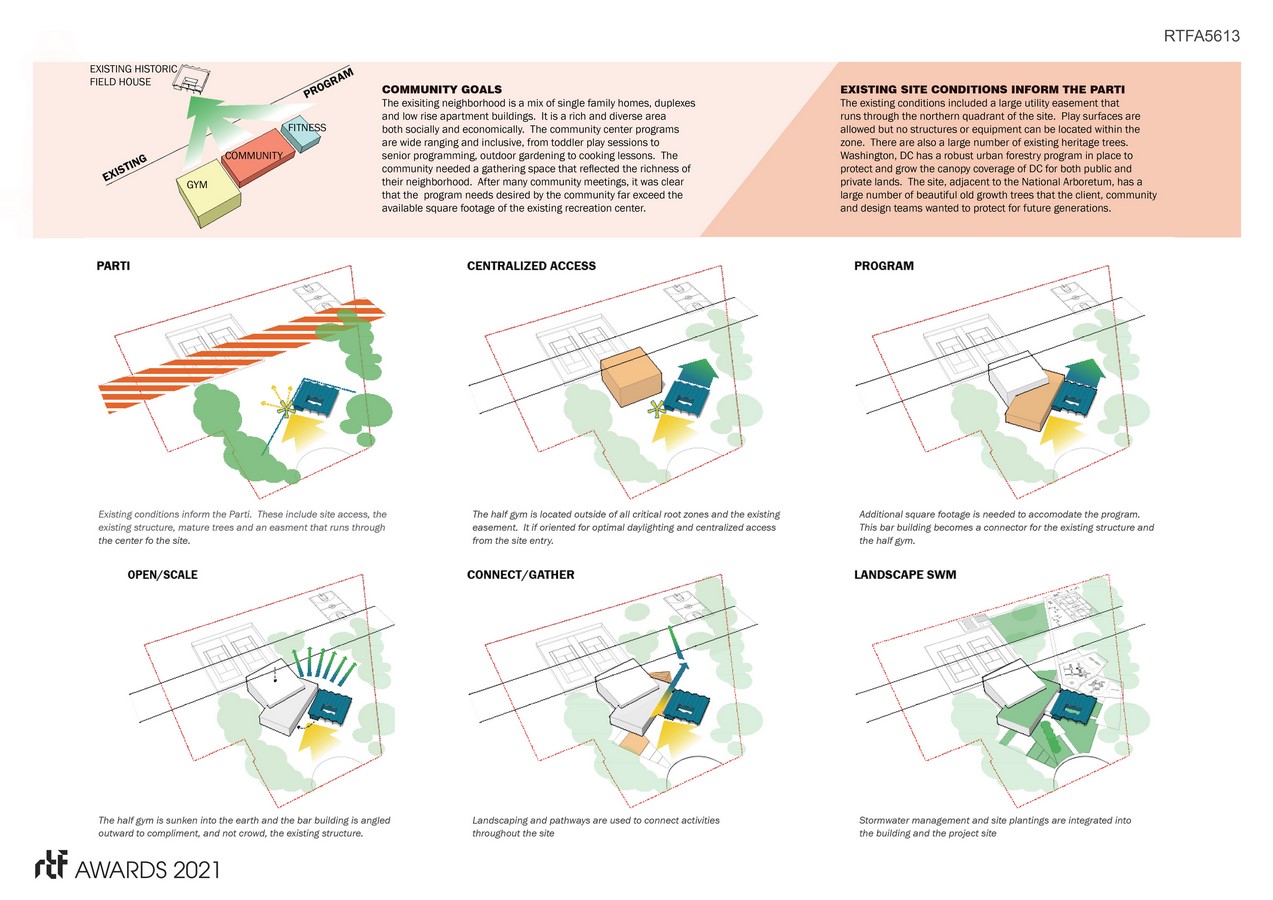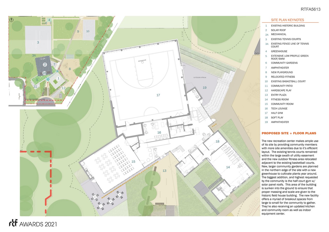 A glass connector piece abuts the exiting Field House allowing a daylit lobby and a subtle touch on the historic building while also blurring the lines between interior and exterior. A metal screening element brings a sculptural touch to the project in addition to shading the community room and framing the entrance to the center. The partially sunken community room allows for access to an ample patio, continuing the physical and visual access to exterior spaces as a theme throughout the building. This partially sunken space also allows for a high ceiling which adds to the versatility and flexibility of the room as requested by the community. The Gym being recessed 7′ below grade allows us to expand to an exterior amphitheater and maintaining a connection to the exterior landscape while also creating the height needed for a solar chimney and not towering over the existing historic building. This gym is constructed of CLT, a sustainable wood construction method, adding to the green nature of the building while also bringing warmth to an otherwise often stark typology. Other features such as the green roof and Solar panel array as well as rainwater retention add to the building’s sustainability.